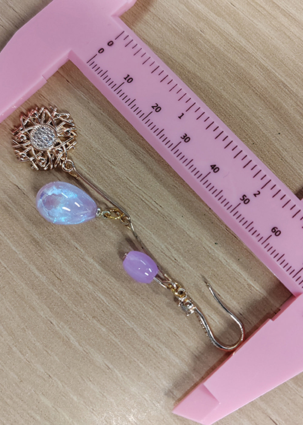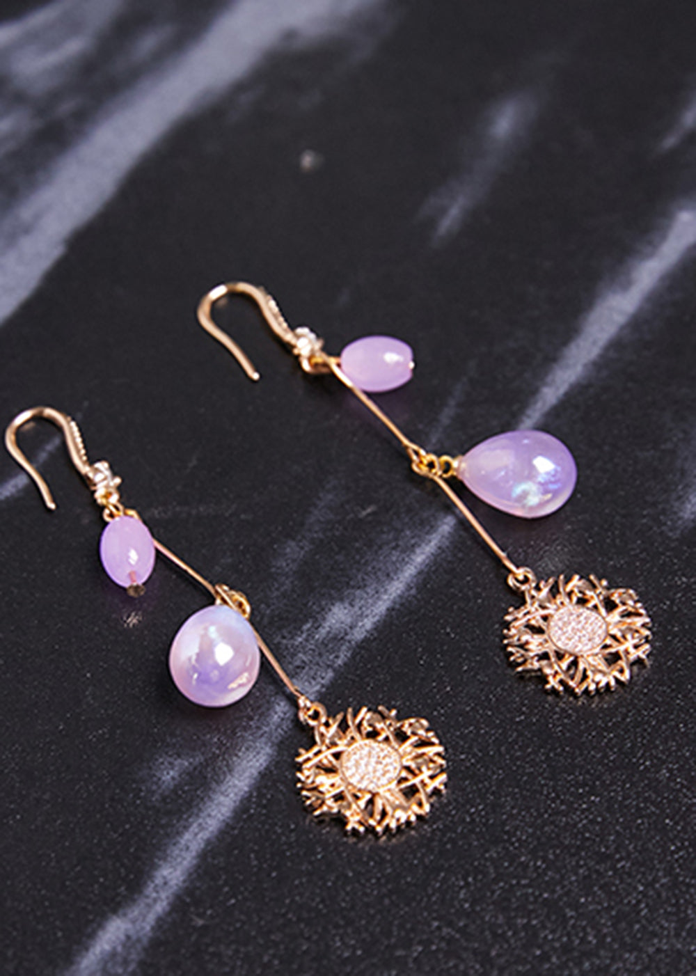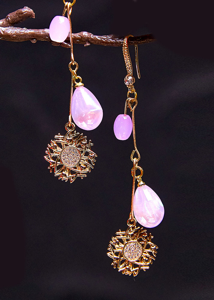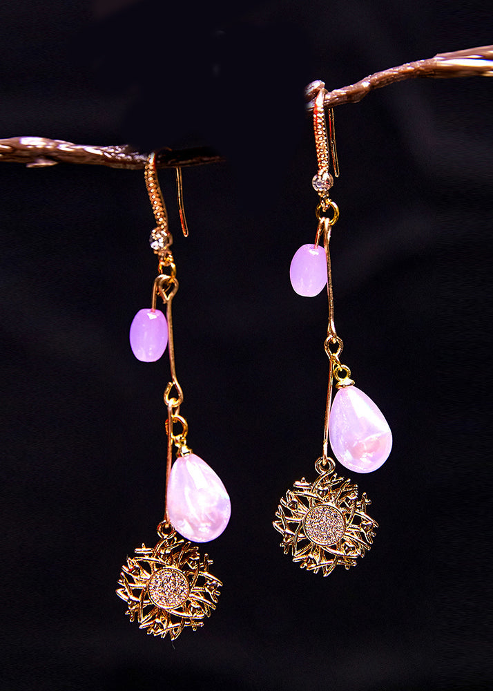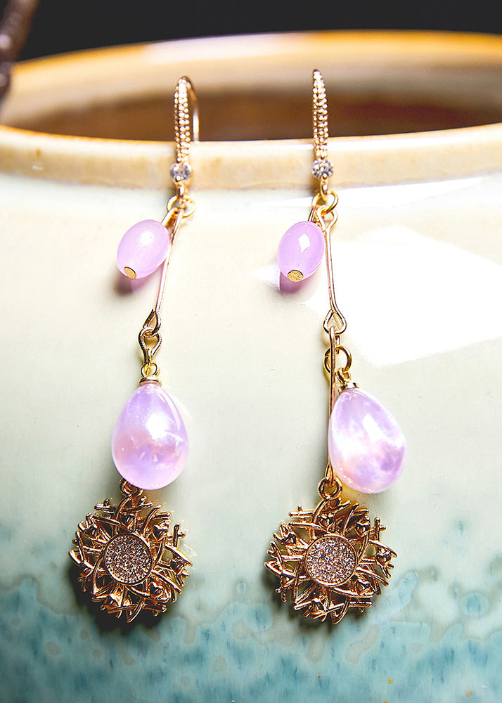 Pendientes colgantes de oro de 14 quilates con forma de girasol y cuentas de agua moradas