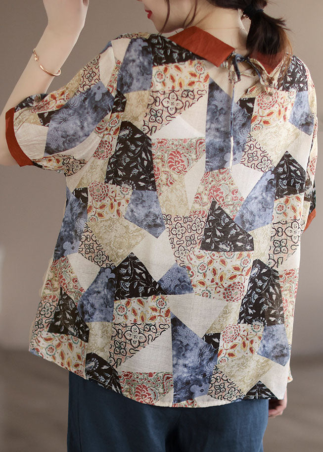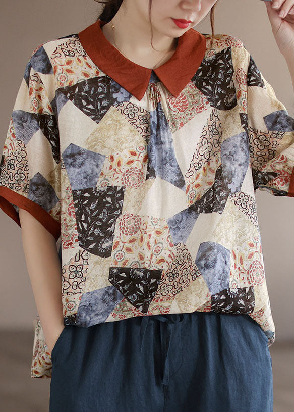 Camiseta de algodón con cuello Peter Pan y estampado patchwork en color albaricoque para verano