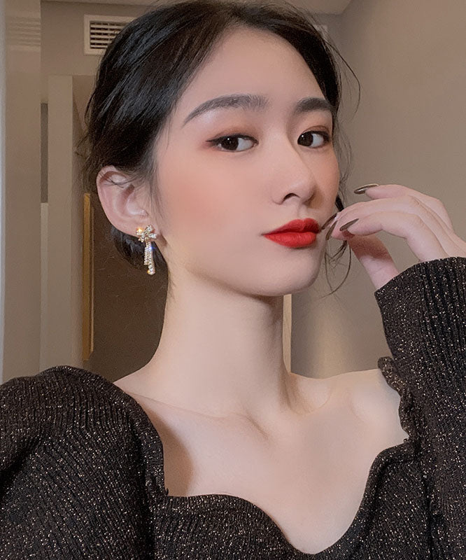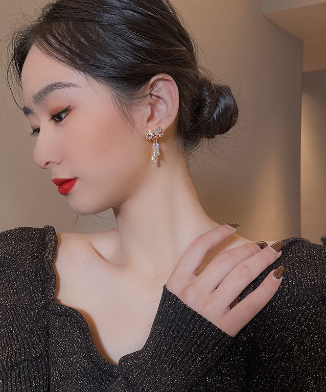 Elegantes pendientes colgantes con borlas y lazo de circonita de aleación de oro