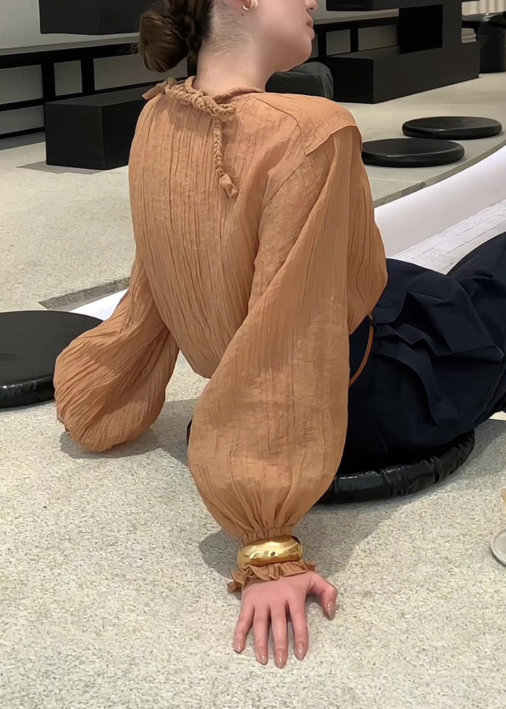 Unique Caramel False Two Pieces Patchwork Cotton Tops Spring