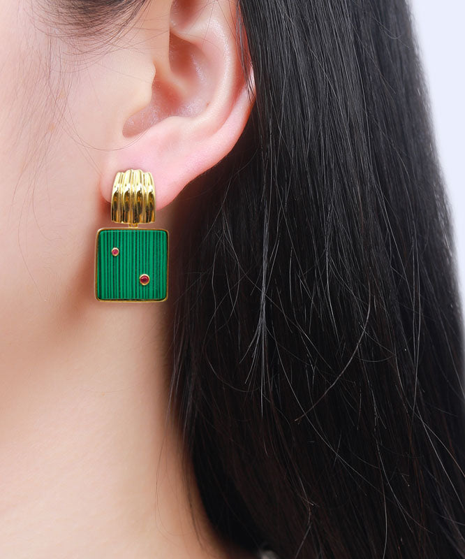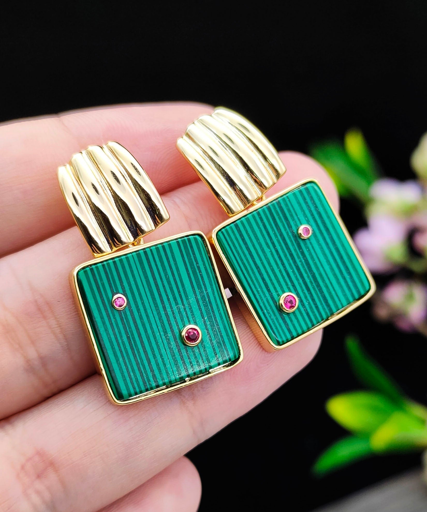Pendientes de aro únicos de plata de ley verde dorada con incrustaciones de malaquita cuadrada