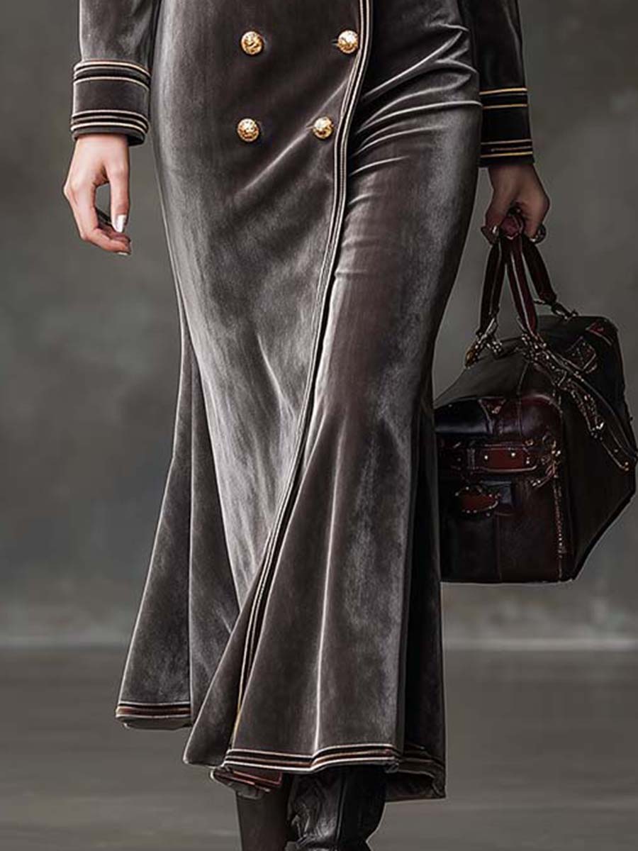This ash taupe velvet maxi dress channels the sophistication of vintage military silhouettes with a feminine twist.