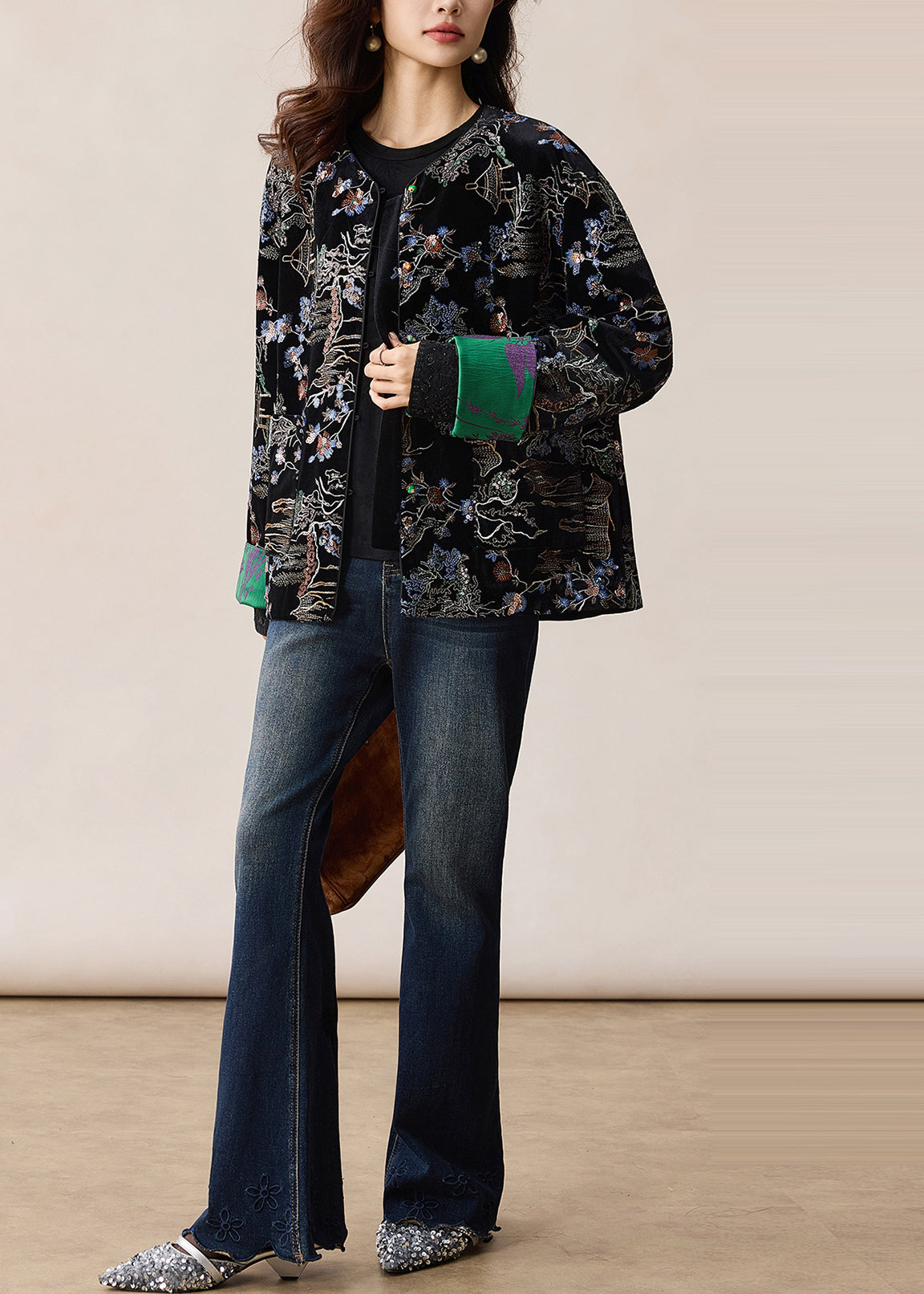 Vintage Black Embroidered Sequins Silk Velvet Coats Winter