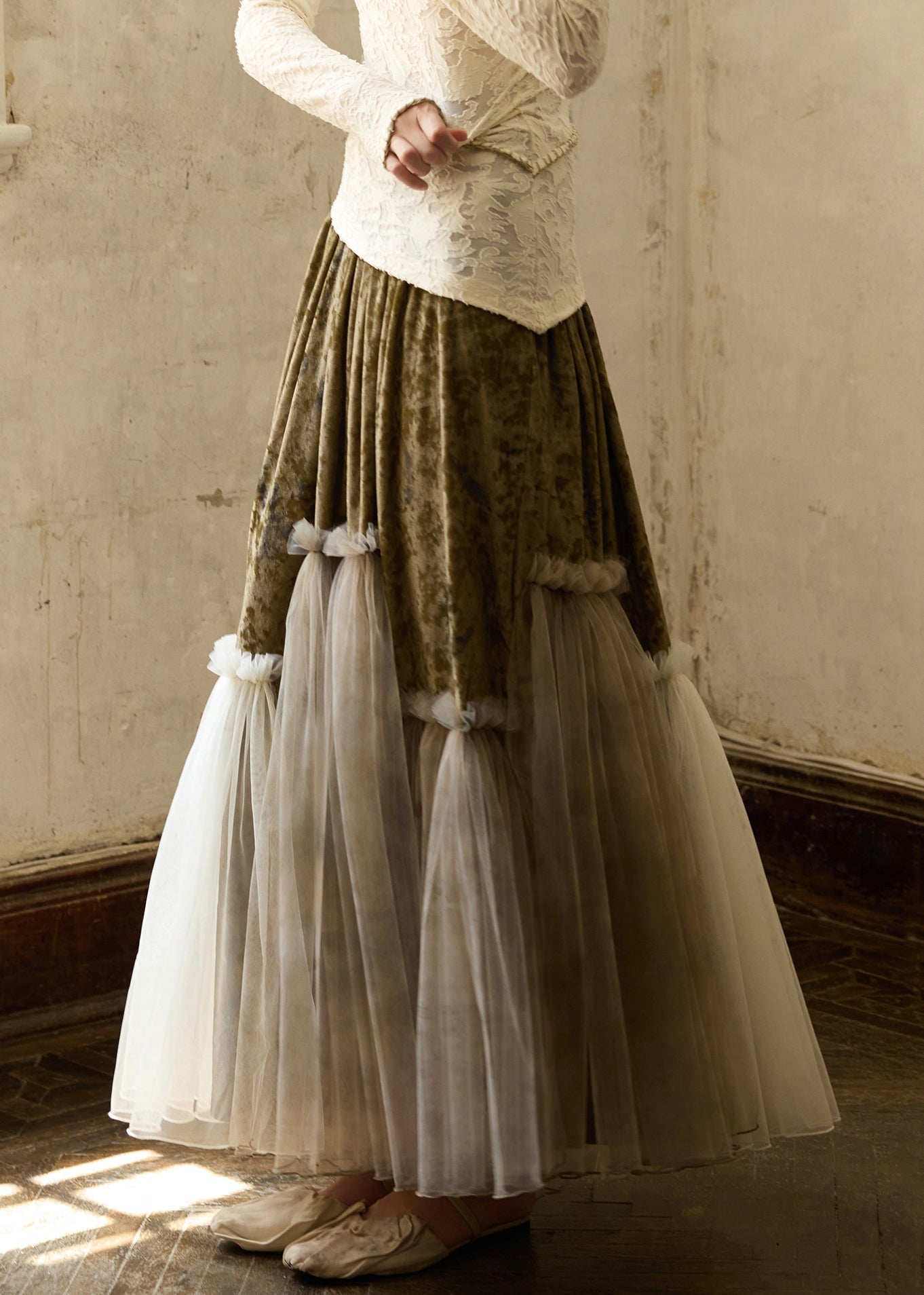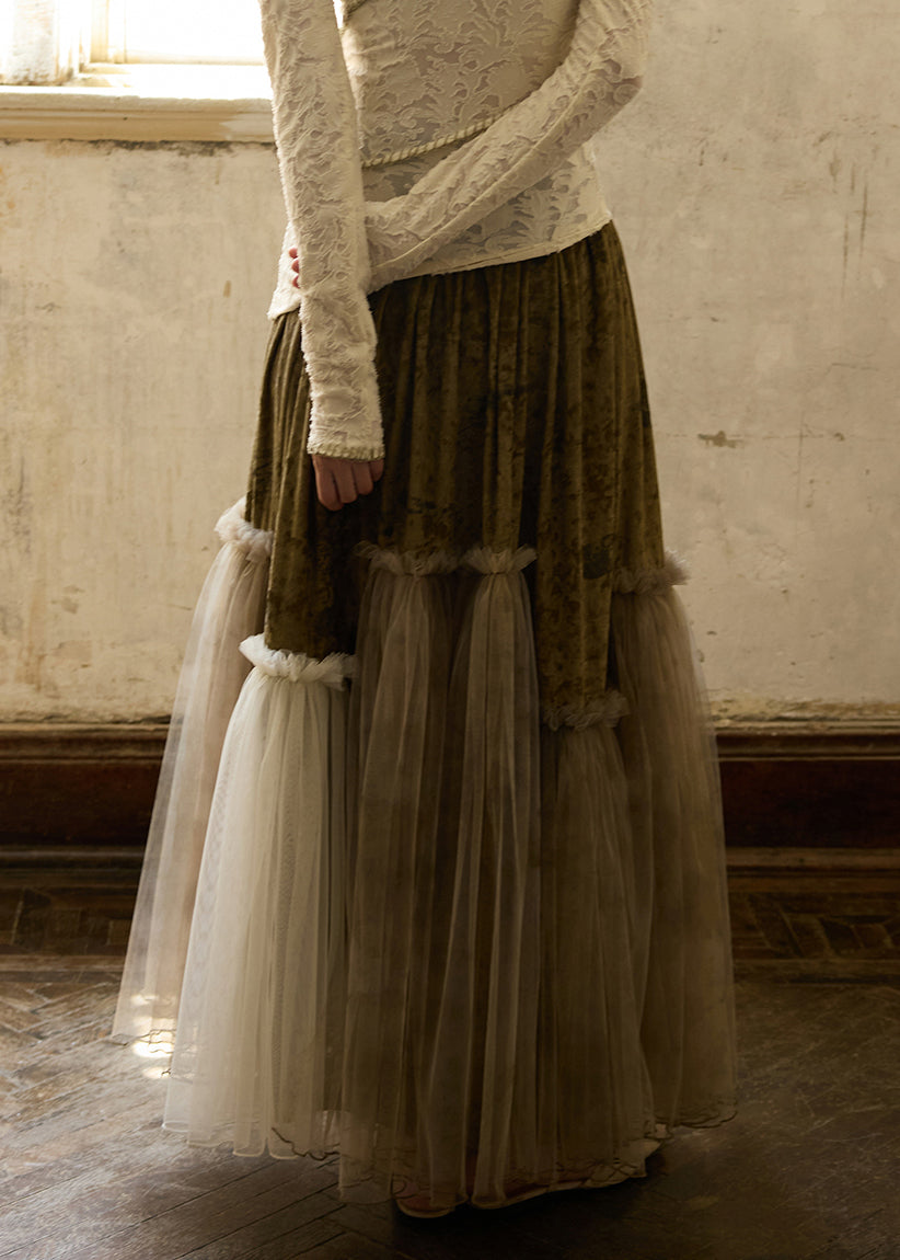Faldas vintage de terciopelo de seda con volantes y cintura elástica de tul y patchwork para invierno.
