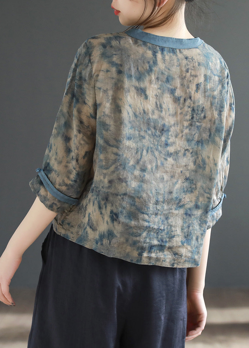 Blusa de ramio con botones y estampado gris vintage de media manga