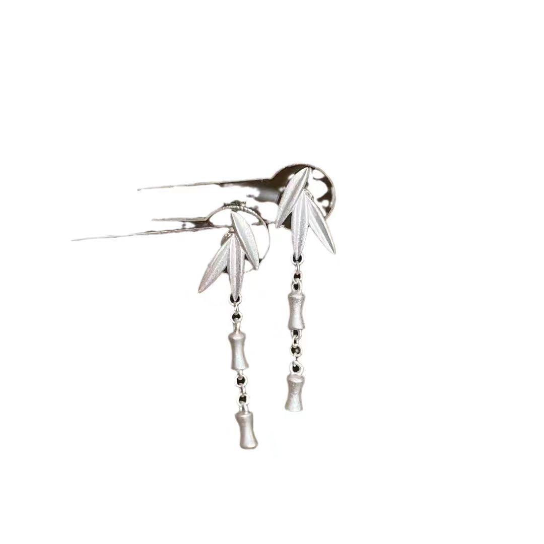 Pendientes colgantes de plata de ley con hojas de bambú y carillón de viento de seda vintage