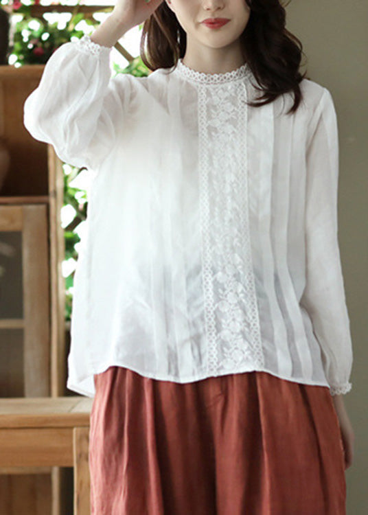 Top blanco de ramio liso arrugado con cuello redondo para primavera