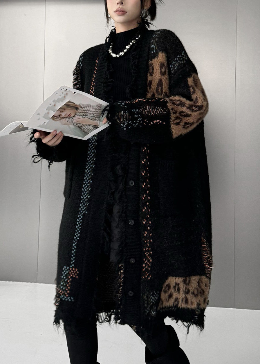 Women Black Print Patchwork Cotton Knit Cardigan Fall