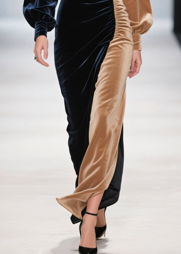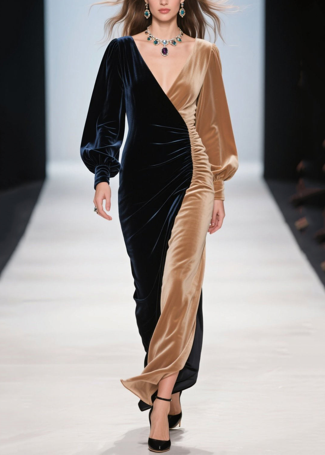 Vestido de cena de terciopelo de seda con patchwork asimétrico y bloques de color para mujer, primavera