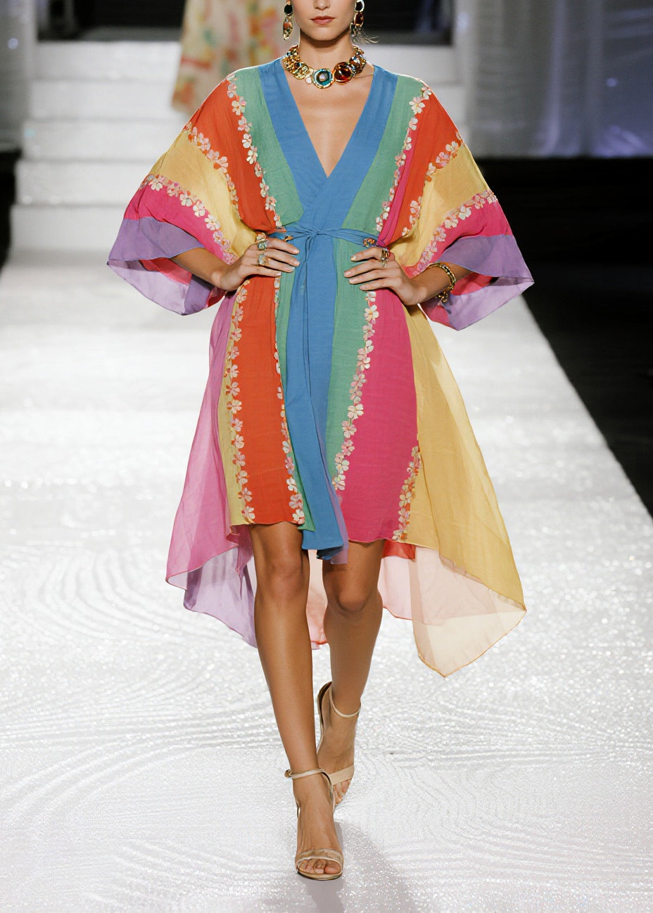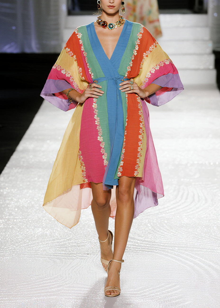 Women Multicolored Striped Flower Cotton Tunic Dress Summer