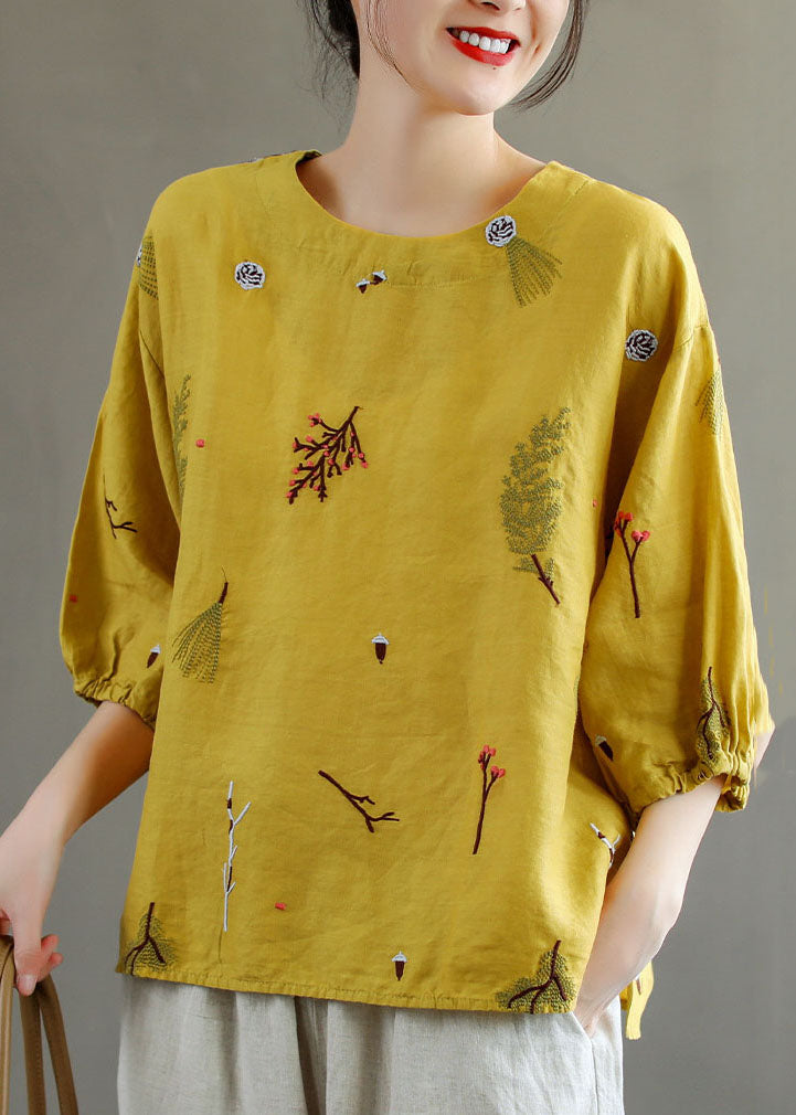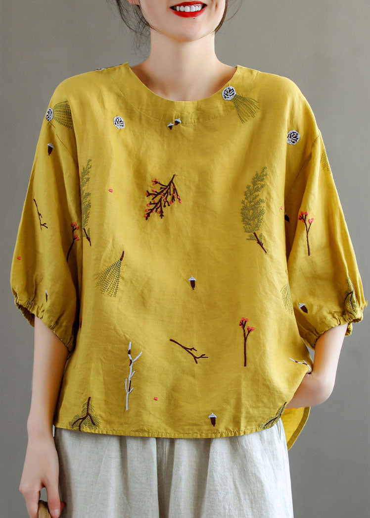 Camisetas de lino con cuello redondo y bordado de patchwork para mujer, color amarillo, para verano