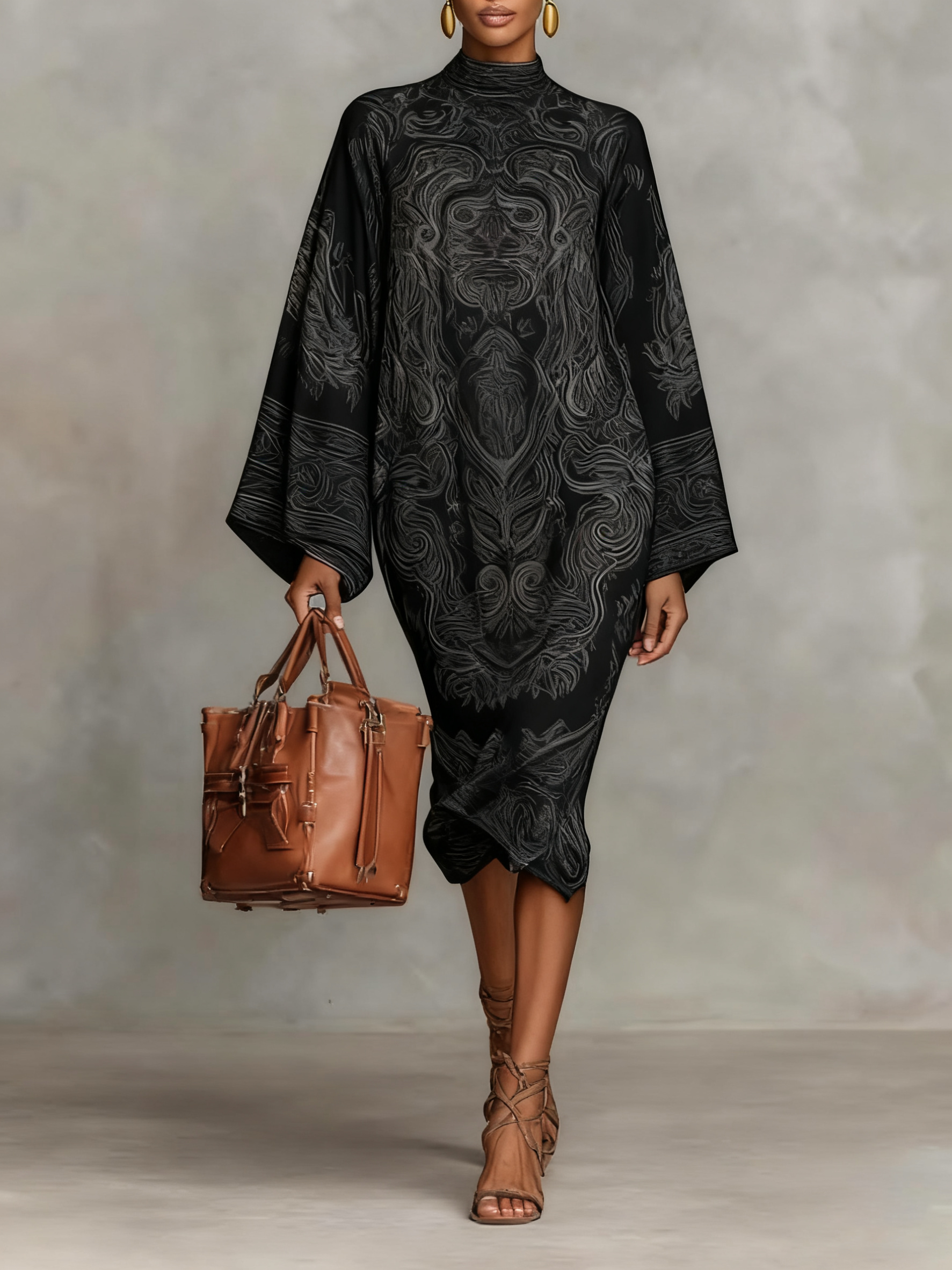 Women's Paisley Print Crew Neck Flared Long Sleeve Loose Medium Dress