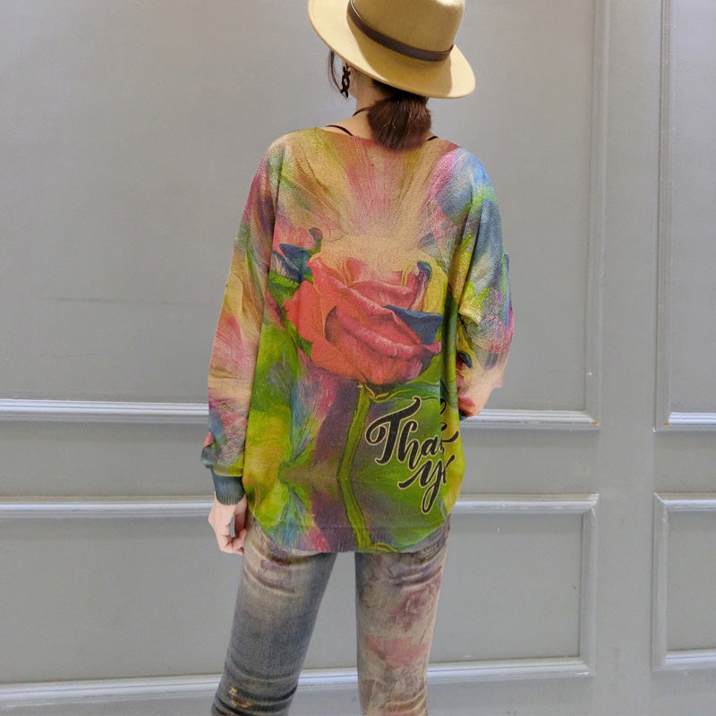 2024 Herbst neue Baumwollstrickoberteile mit Rosendrucken, plus Größe, langärmeliger Pullover