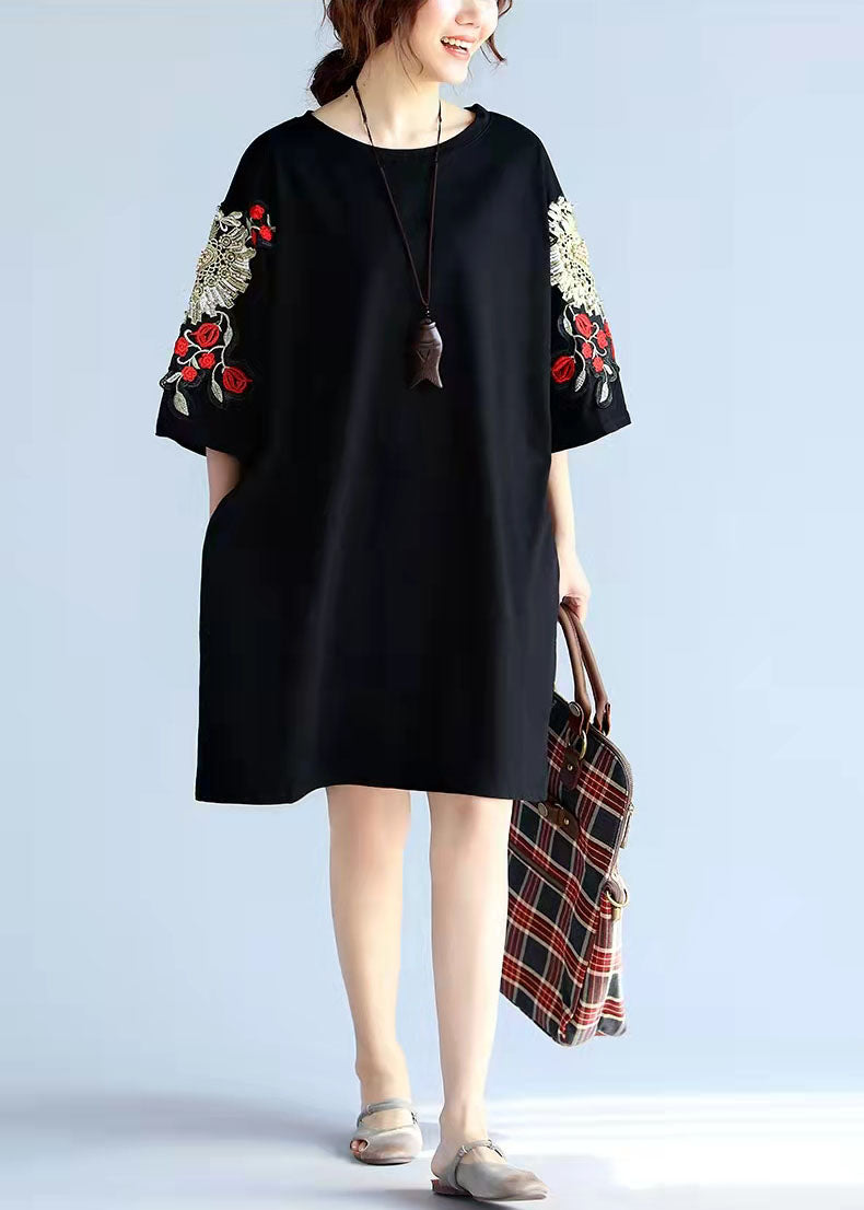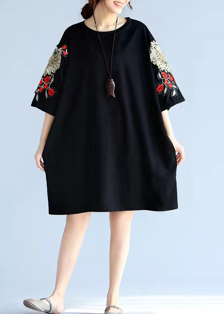 2021 einzigartiger, stylischer schwarzer Baumwollpullover mit Stickerei und Applikationen in Übergröße, kurzärmelige, mittellange Oberteile