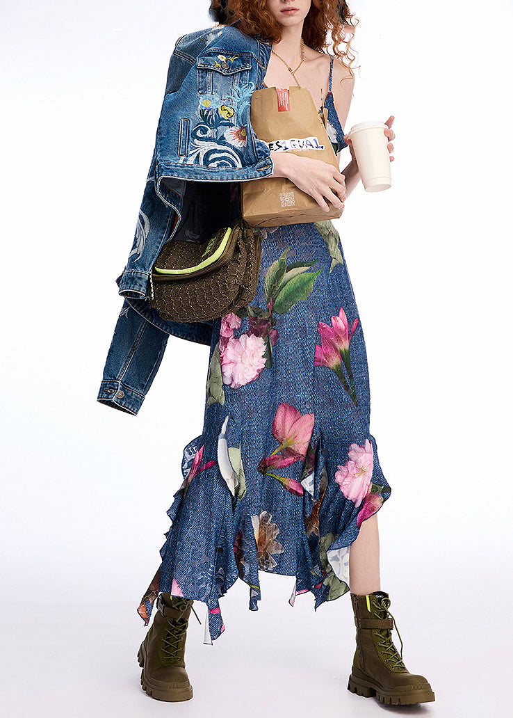 2025 New Blue Ruffled Print Cotton Spaghetti Strap Dress Summer