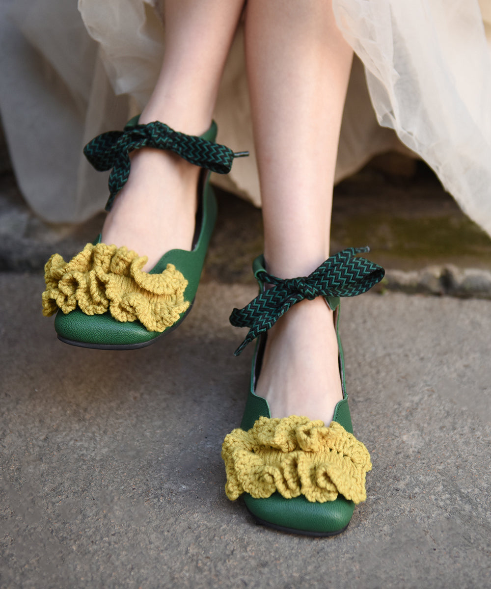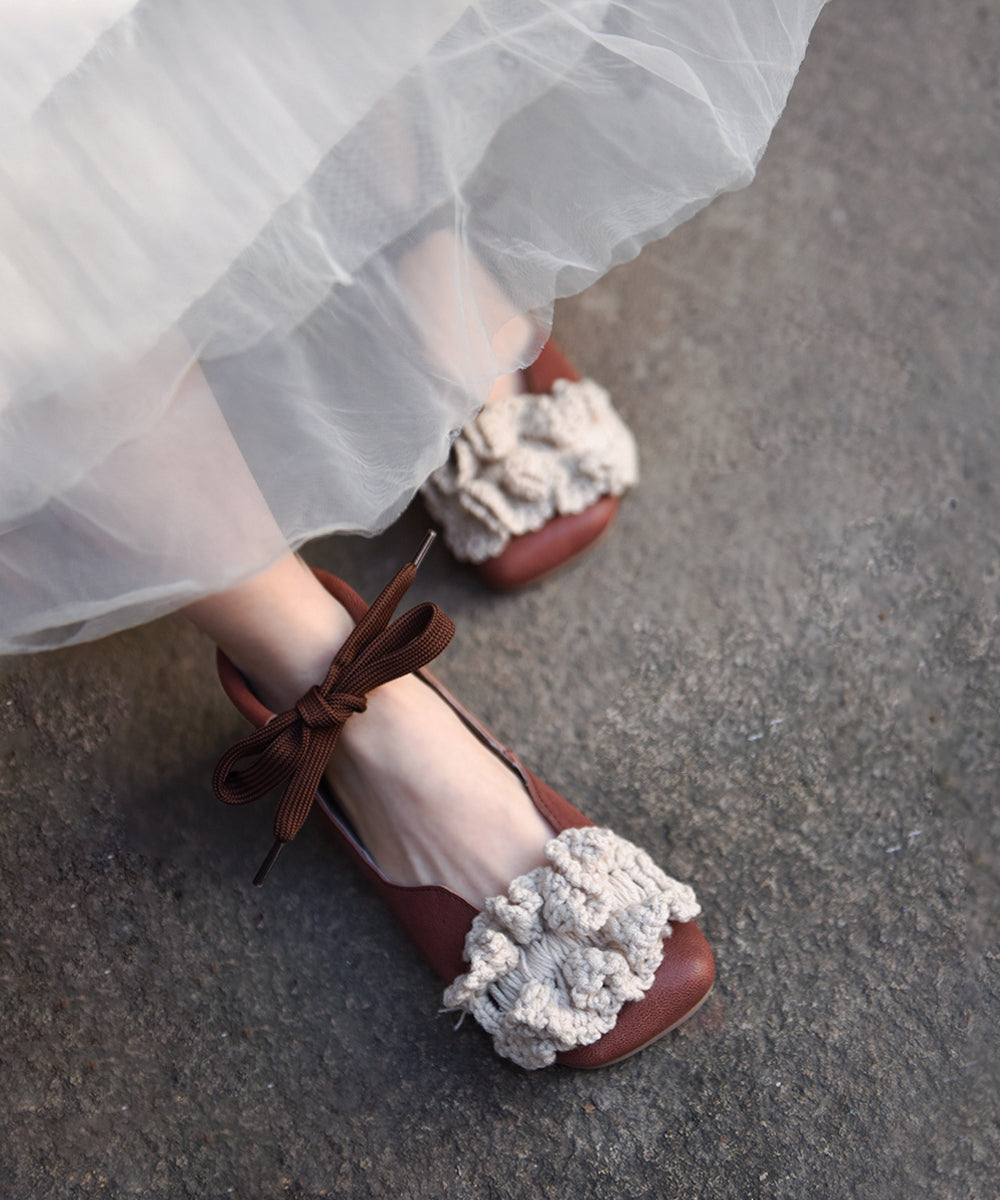 2025 New Floral Splicing Flat Shoes Caramel Sheepskin Lace Up