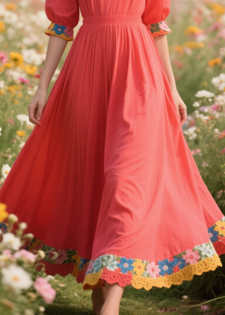 Art Brick Red Patchwork Exra Large Hem Cotton Holiday Dress Summer