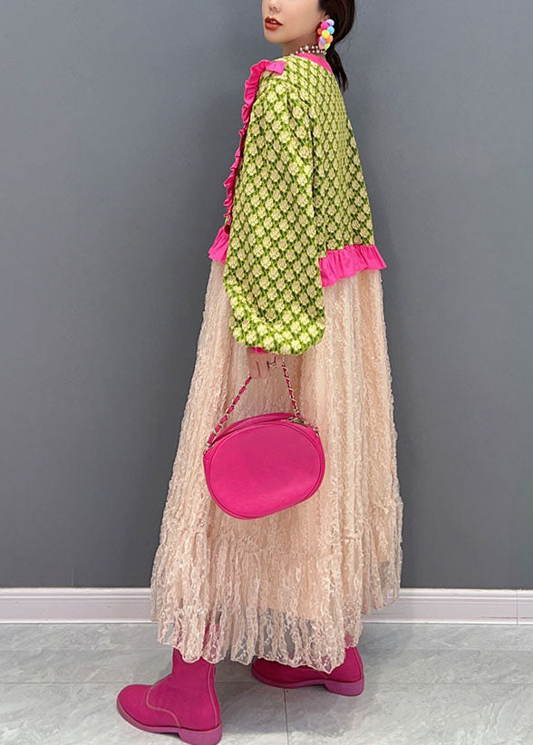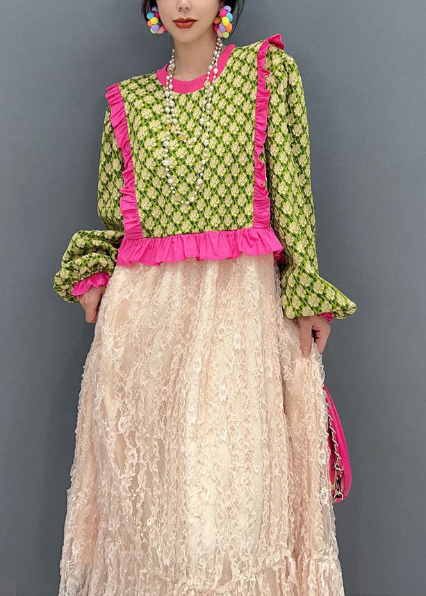 Kunst Grün O-Ausschnitt Rüschen Patchwork Tüll Maxi Kleider Frühling