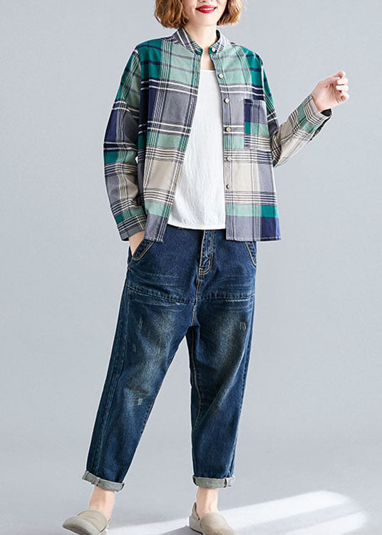 Art Green Taschen Knopf Patchwork Herbst Plaid Langarm Top