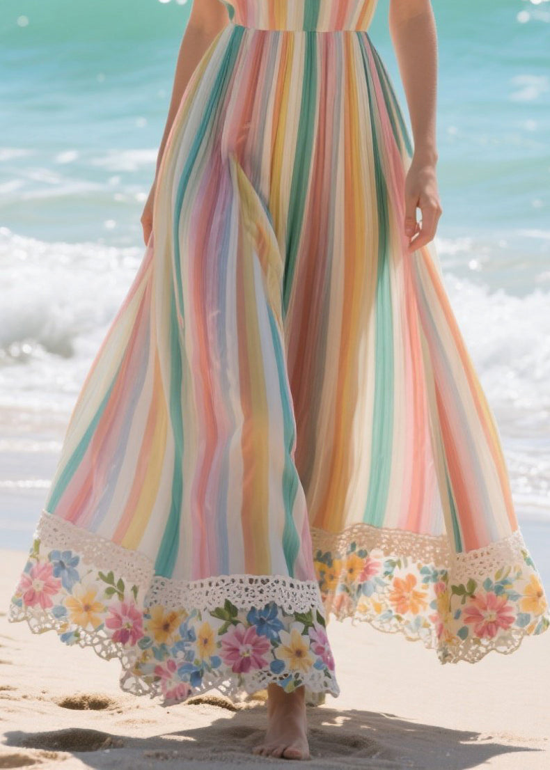 Art Rainbow Striped Patchwork Lace Chiffon Holiday Dresses Summer