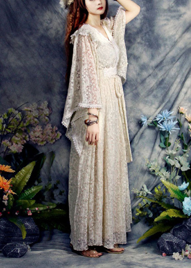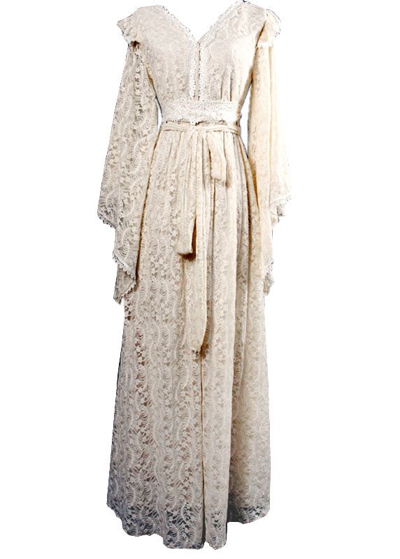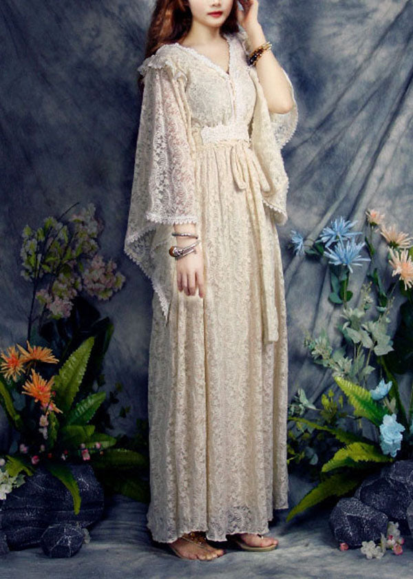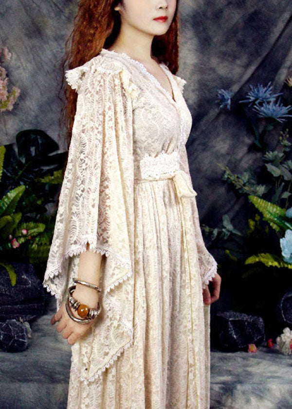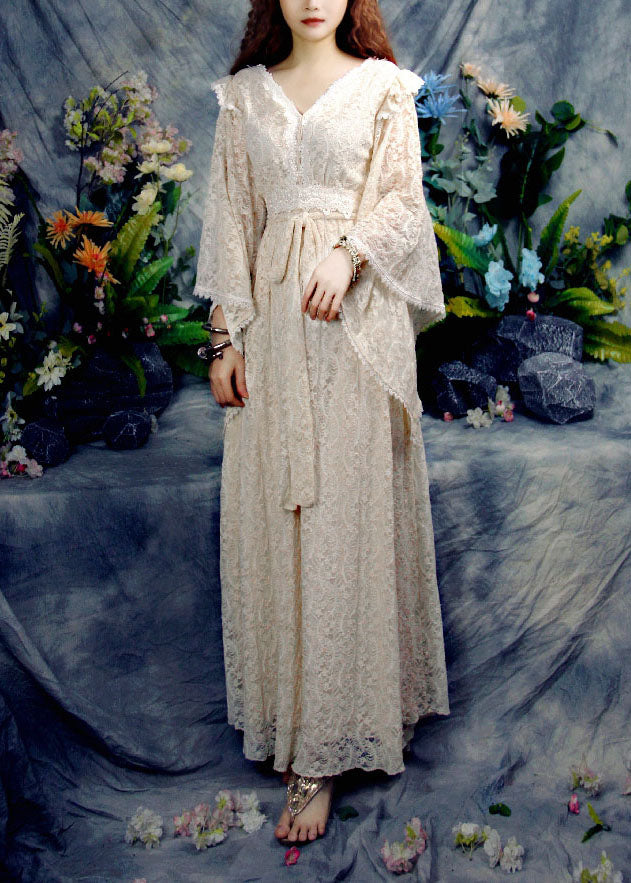 Schöne Aprikose V-Ausschnitt Aushöhlen Spitze Urlaub Cinch Kleider Frühling
