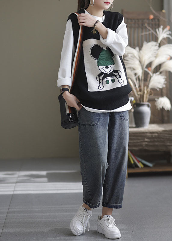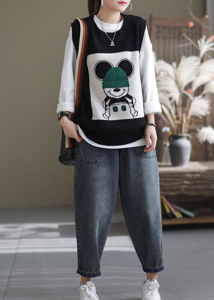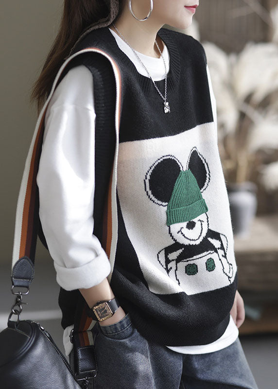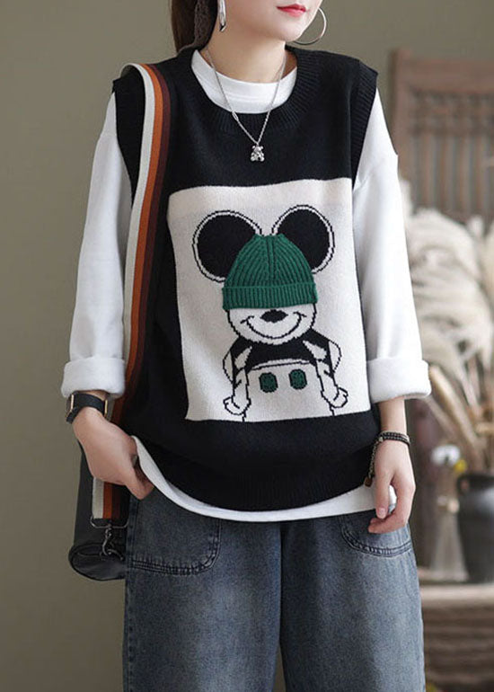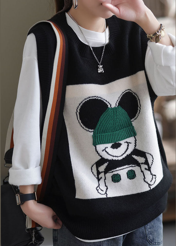 Schöne schwarze O-Ausschnitt Tier Strickweste ärmellos