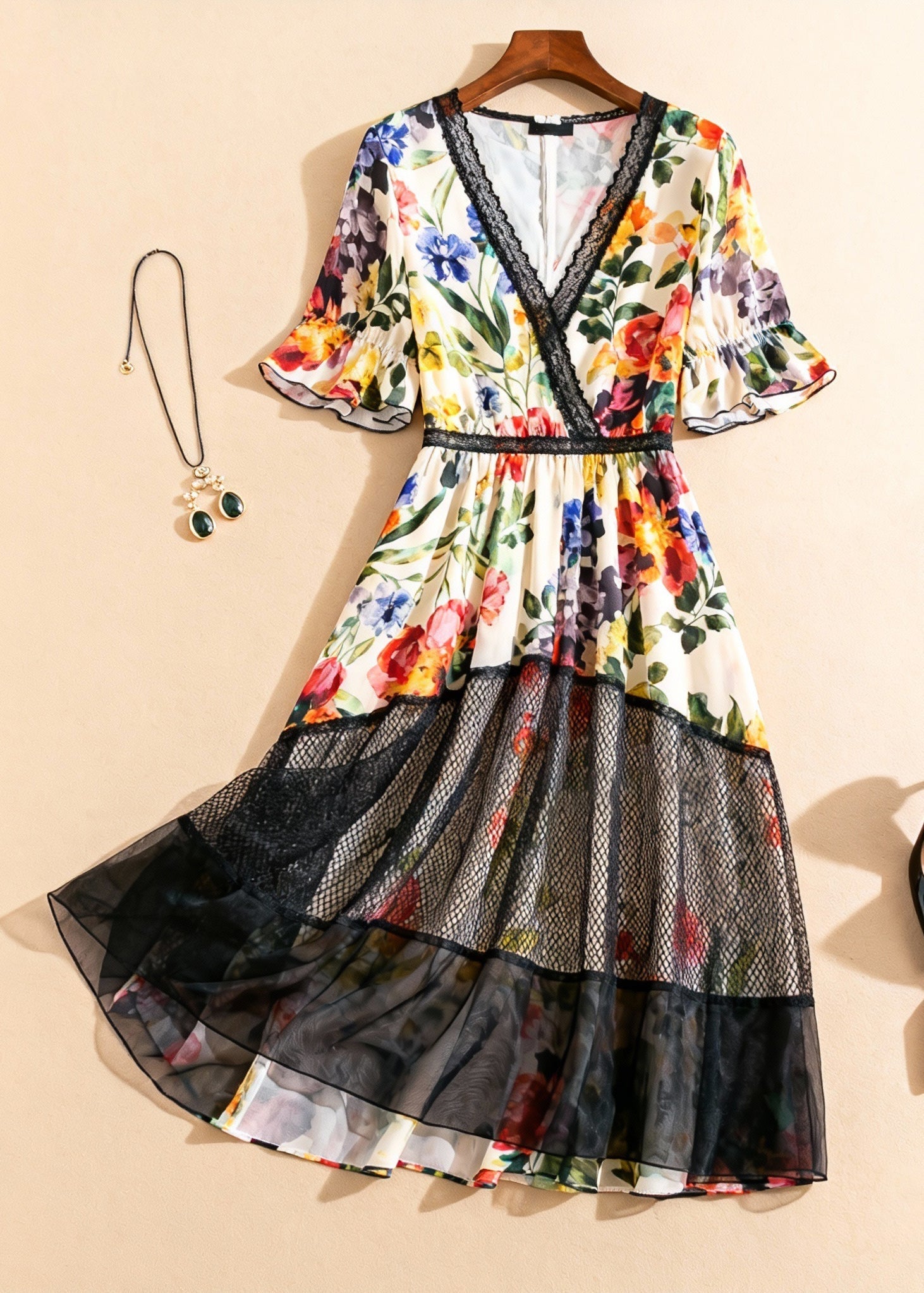 Beautiful V Neck Print Tulle Patchwork Long Dress Summer