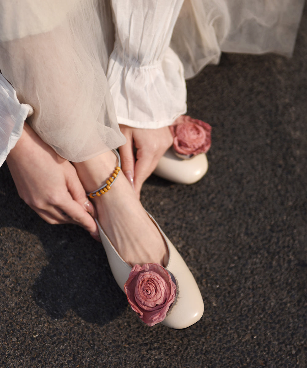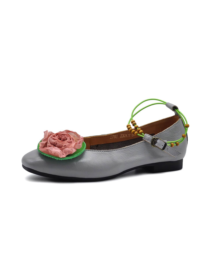 Beige Cowhide Leather Classy Splicing Floral Flat Feet Shoes