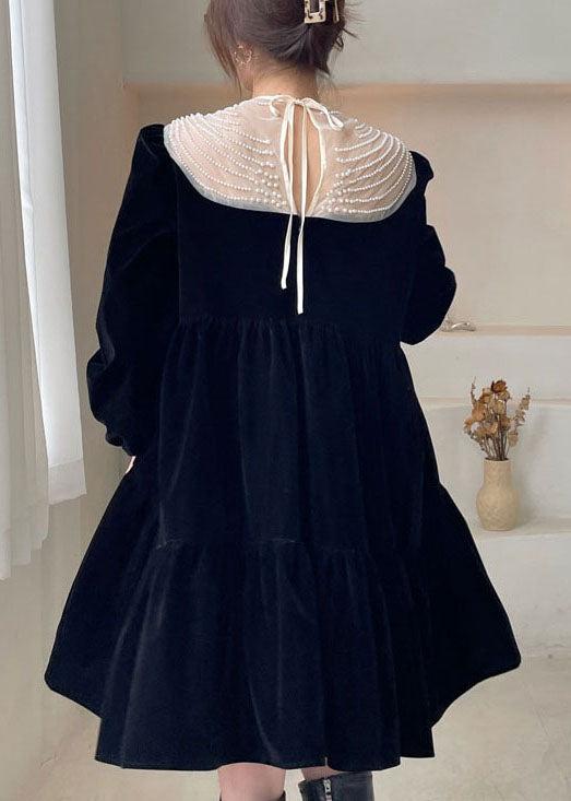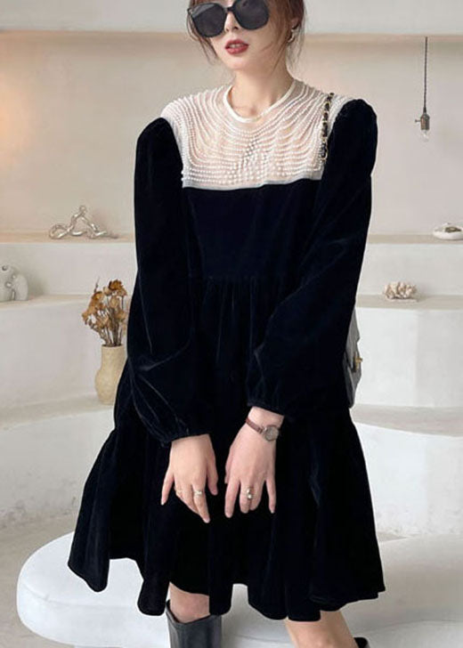 Schwarzes O-Ausschnitt Nagelperlen Velours Urlaubskleid Frühling