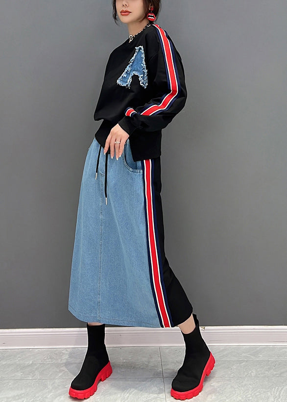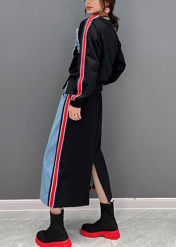 Schwarzer O-Ausschnitt gestreifter Pullover und Röcke Zweiteiliger Anzug