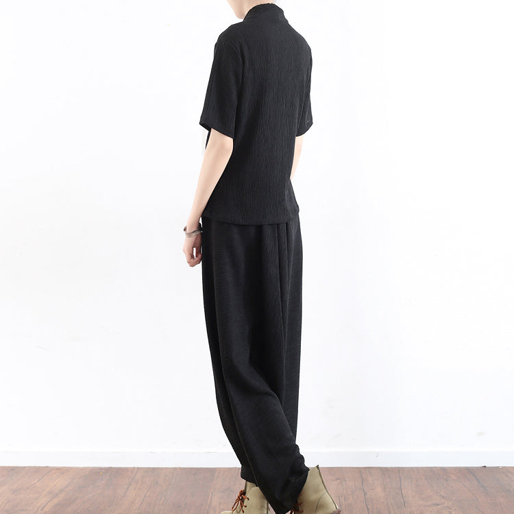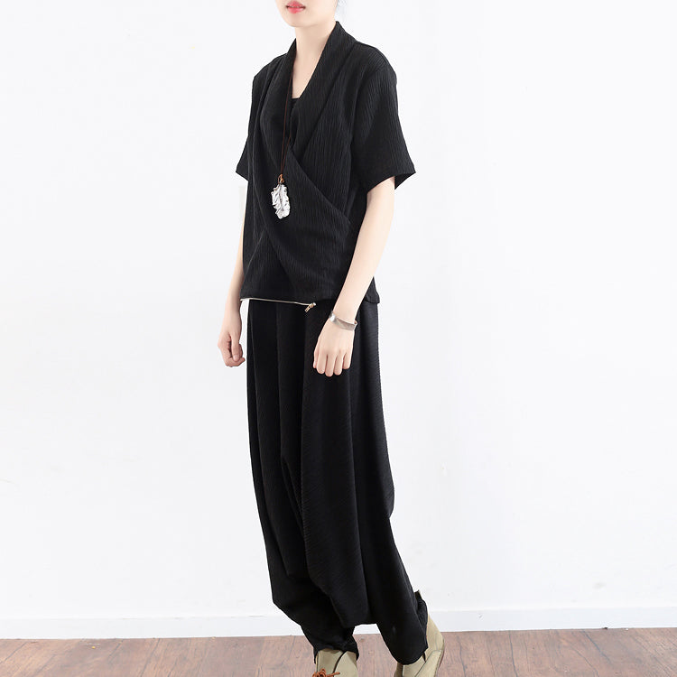 schwarze Seidentops mit Kreuzdesign und Haremshosen, zweiteilig