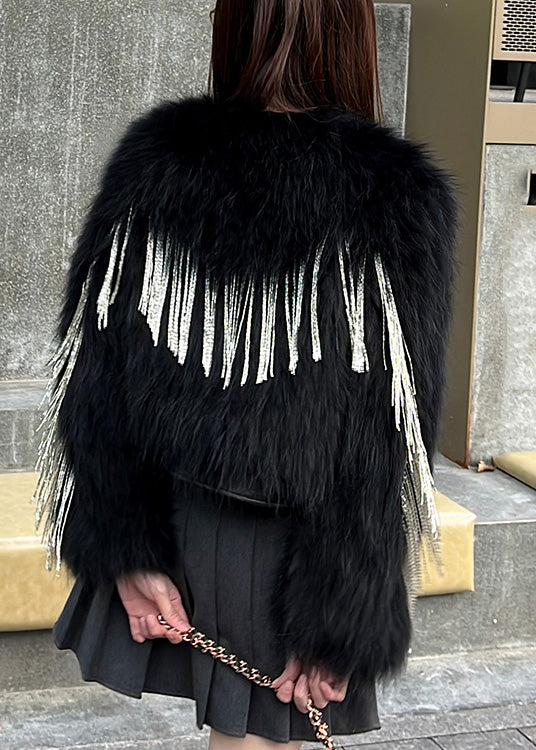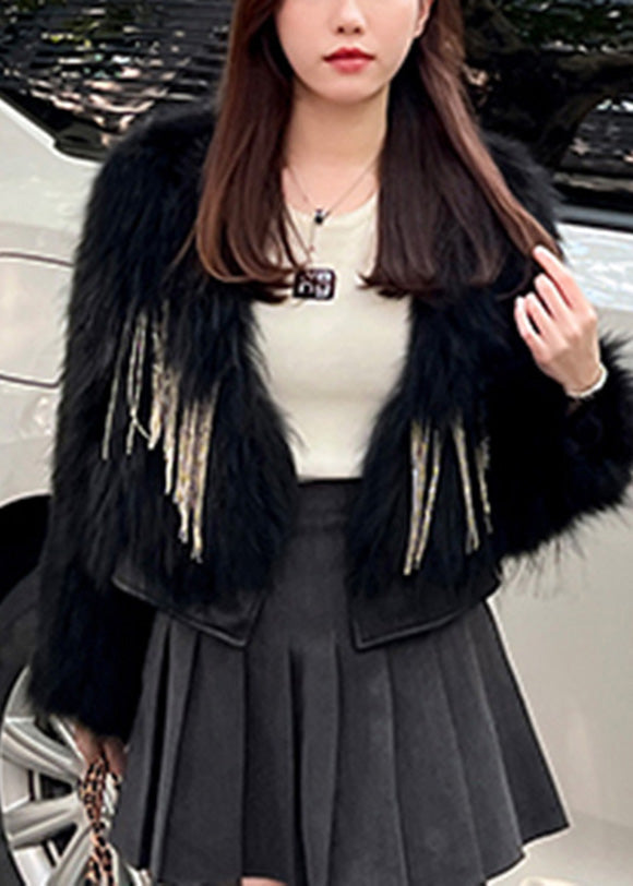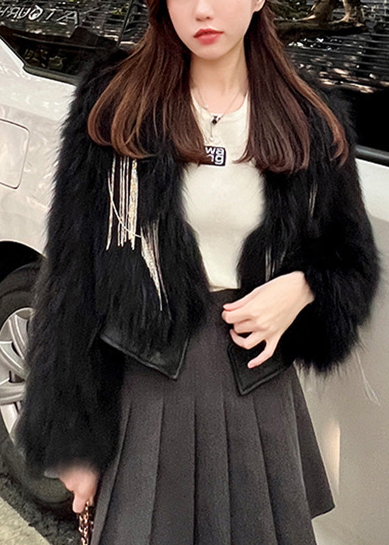 Schwarzer V-Ausschnitt Patchwork Kunstleder und Kunstpelz Mäntel Winter