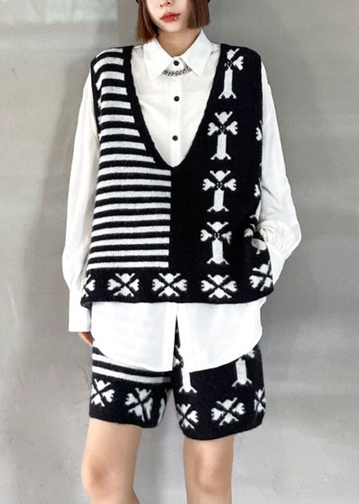 Bohemian Black Fashion Jacquard-Strickweste mit V-Ausschnitt + weites Bein, zweiteiliges Herbst-Set