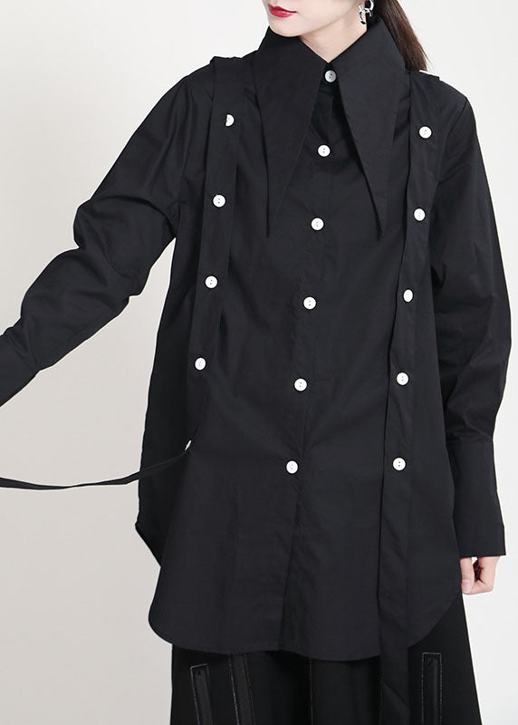 Boho Schwarz Peter Pan Kragen Knopf Asymmetrisches Design Patchwork Herbst Shirts Langarm