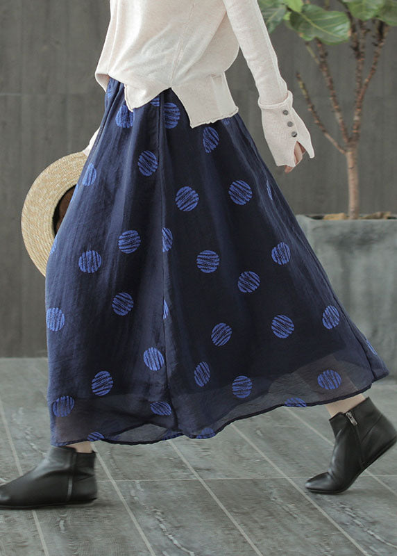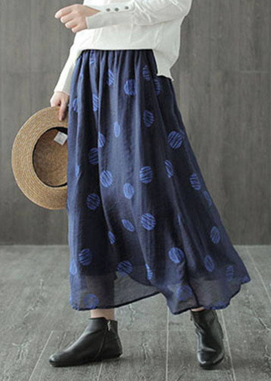Boho dunkelblau elastische Taille Punktdruck Leinen Röcke Frühling