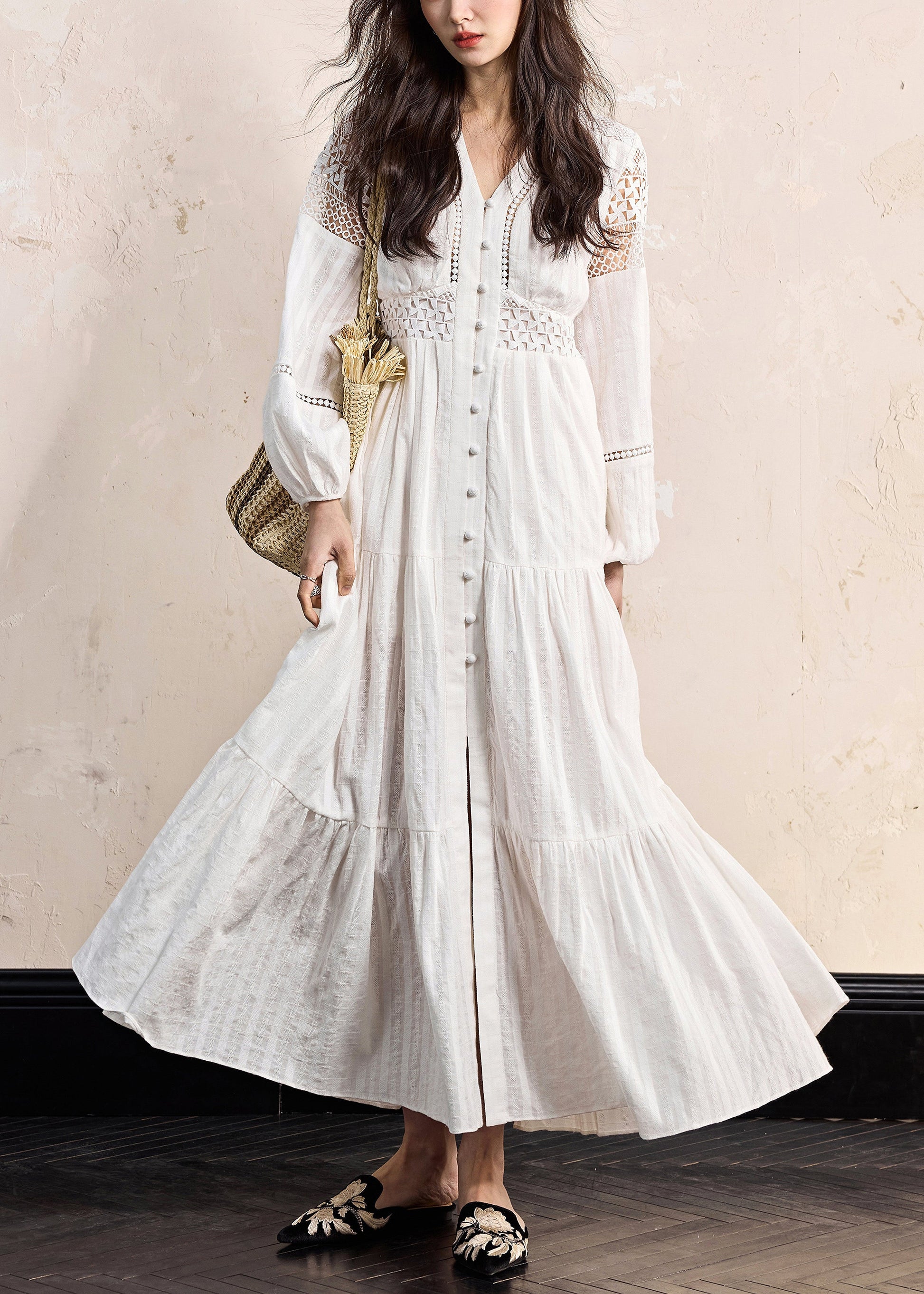 Boho White Hollow Out Wrinkled Cotton Blouses Dress Fall