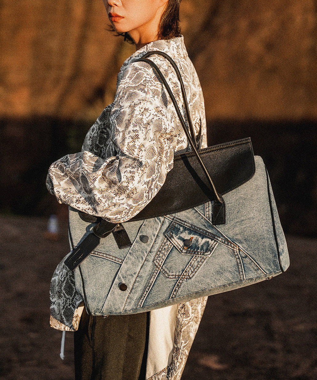 Boutique Blue Denim Patchwork Calf Leather Shoulder Bag