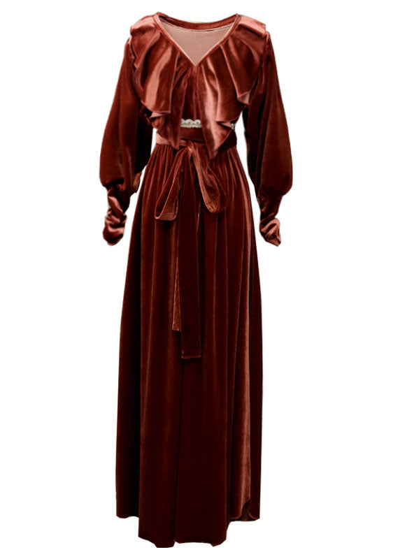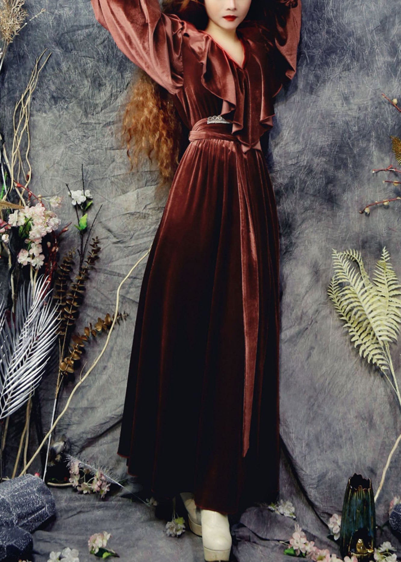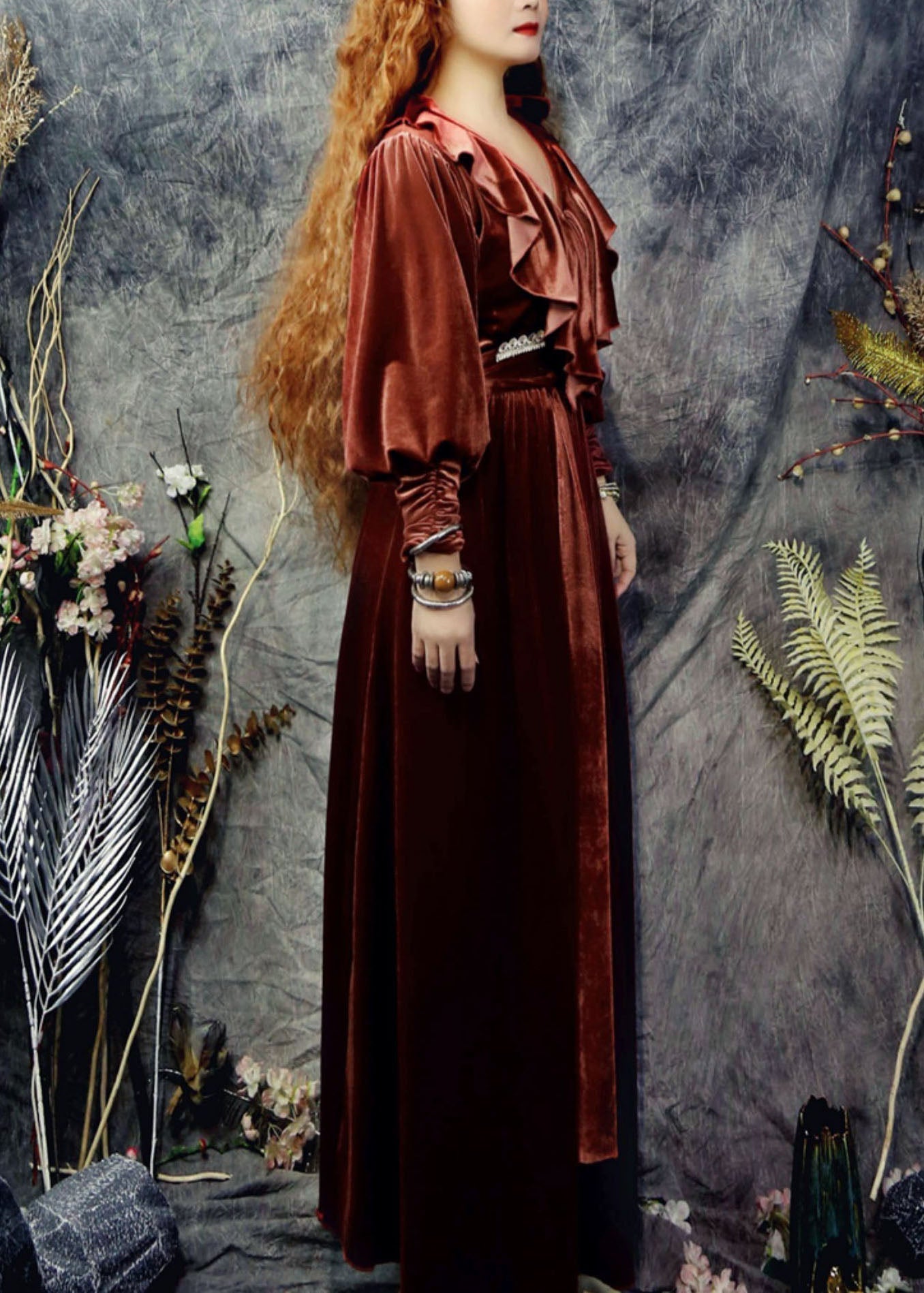 Boutique Ziegelrot V-Ausschnitt Rüschen Seidenvelours Cinch Kleider Frühling