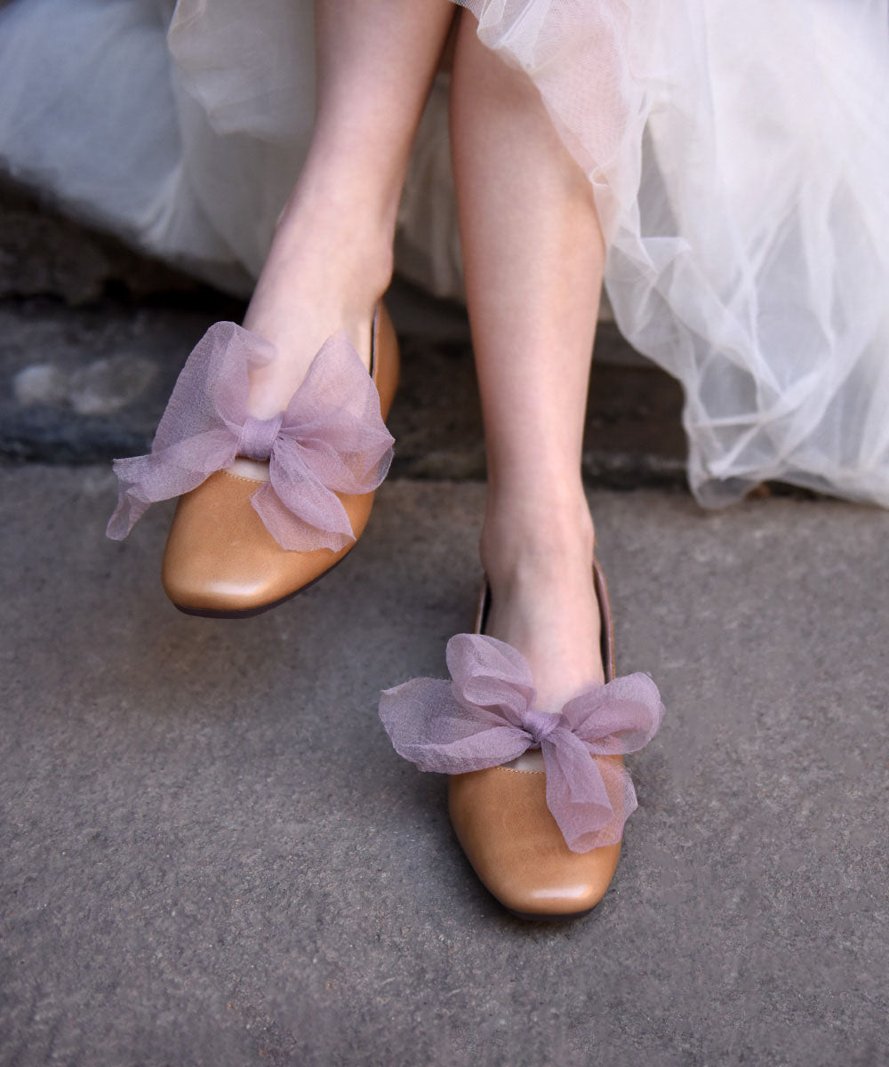 Boutique Brown Cowhide Leather Splicing Bow Penny Loafers