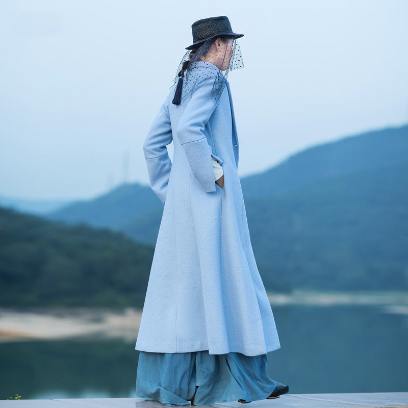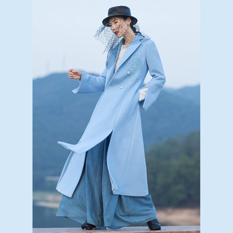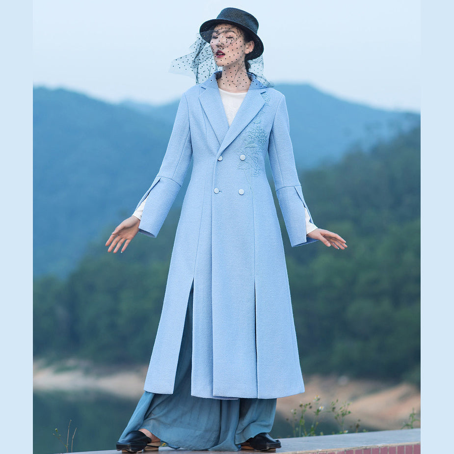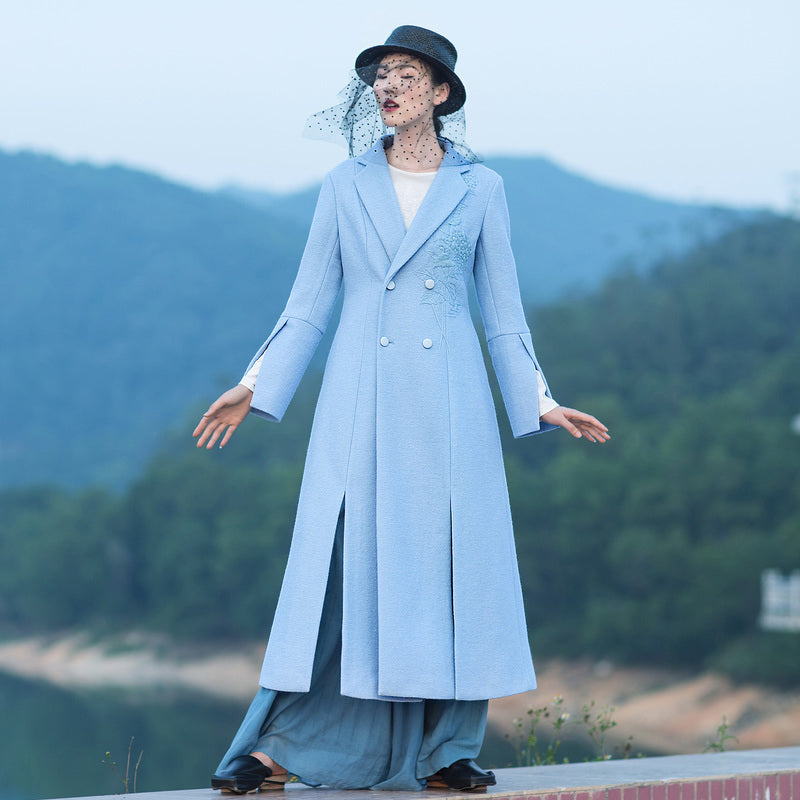 Boutique hellblauer Wollmantel Damen Locker sitzender langer Mantel offene Langarm-Stickereimäntel
