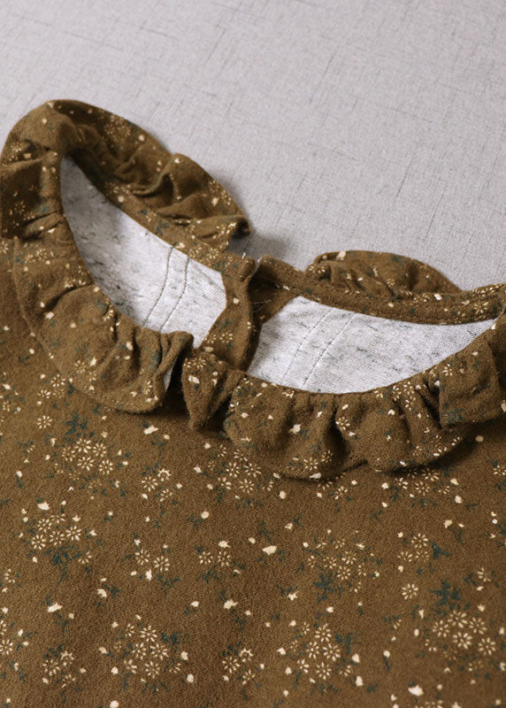 Boutique Gelb Grün Rüschen Print Baumwolle Langes Kleid Frühling