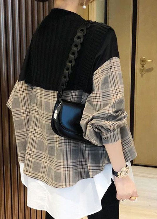 Lässiges schwarzes Strick-Patchwork-Karo-Langarmhemd für den Herbst