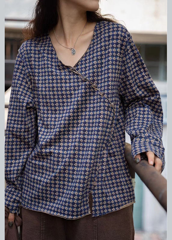 Lässiges, blau kariertes V-Ausschnitt-Knopf-Kordelzug-Herbsthemd