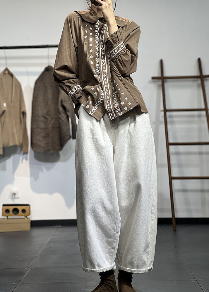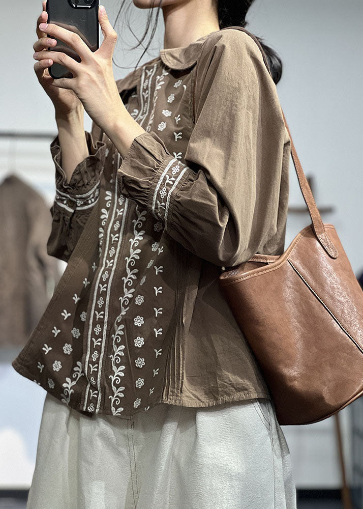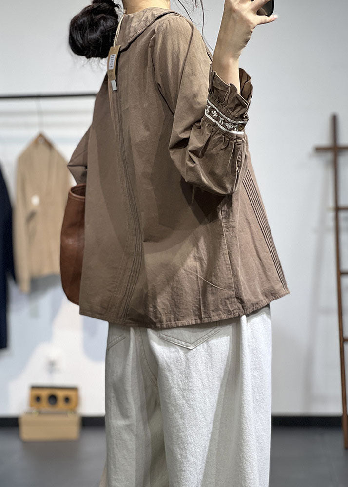 Lässiges Schokoladenbraunes Peter Pan Kragen Besticktes Knitter Baumwollhemd Herbst