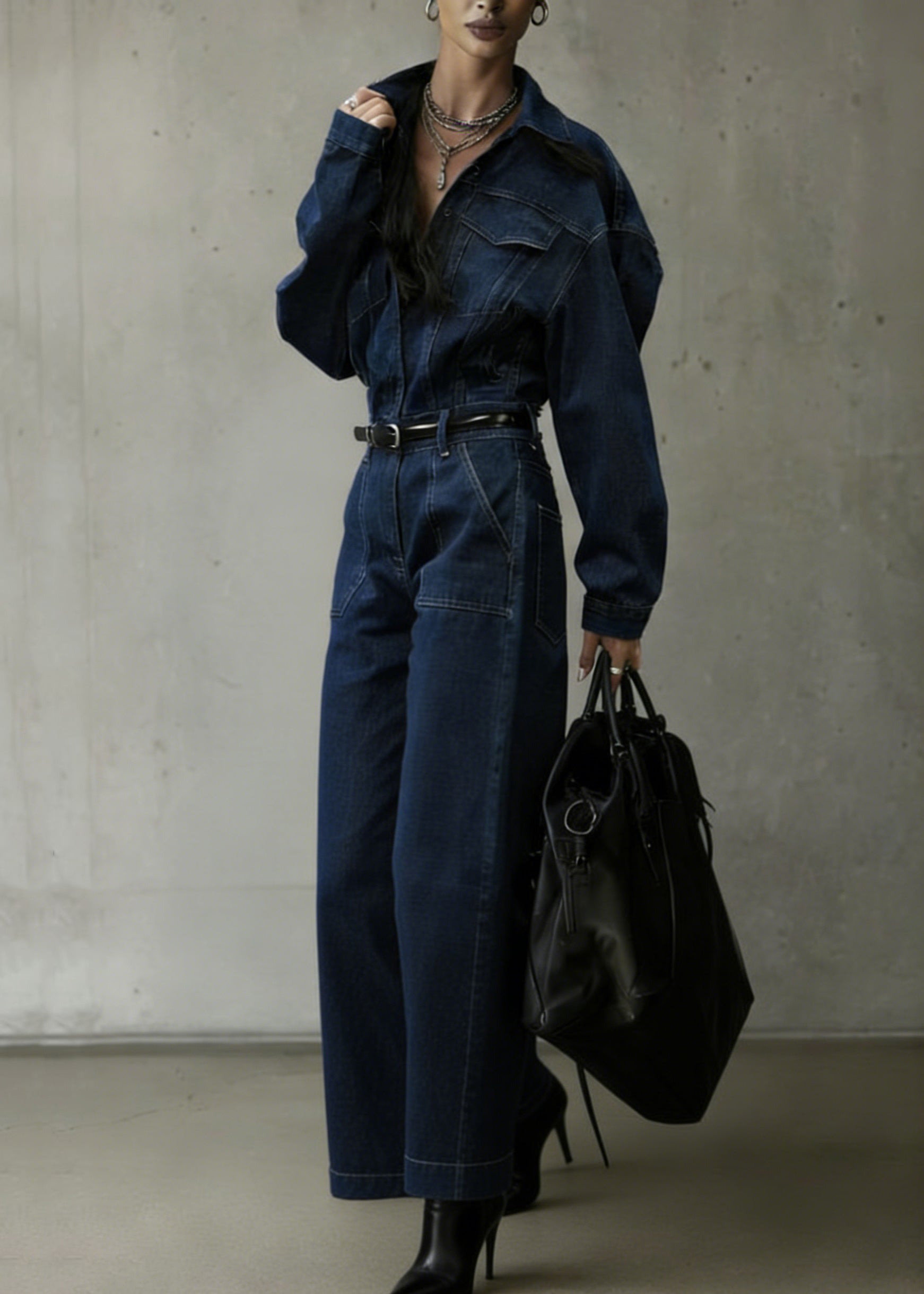 Casual Denim Blue Peter Pan Collar Patchwork Pocket Jumpsuit Spring