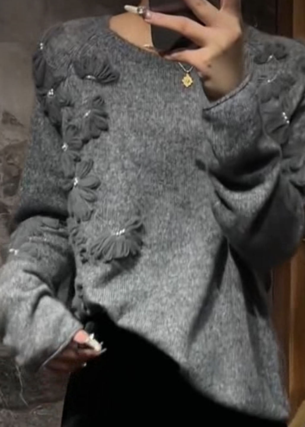 Casual Grey O-Neck Floral Cotton Knit Sweater Spring