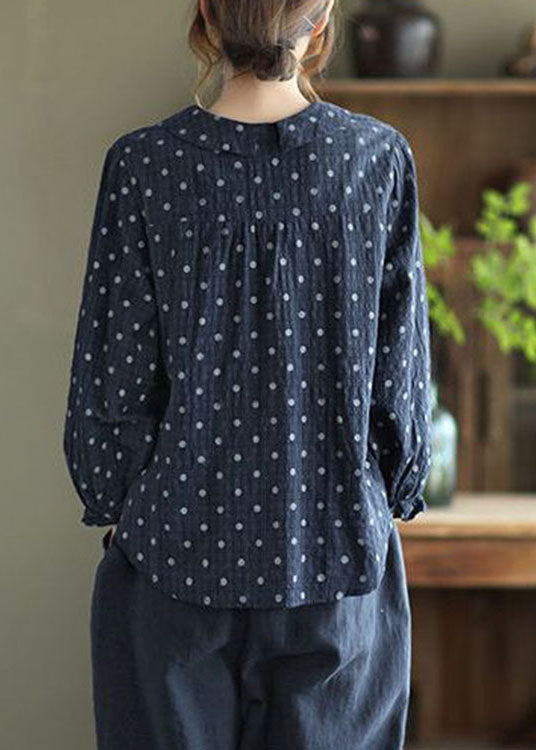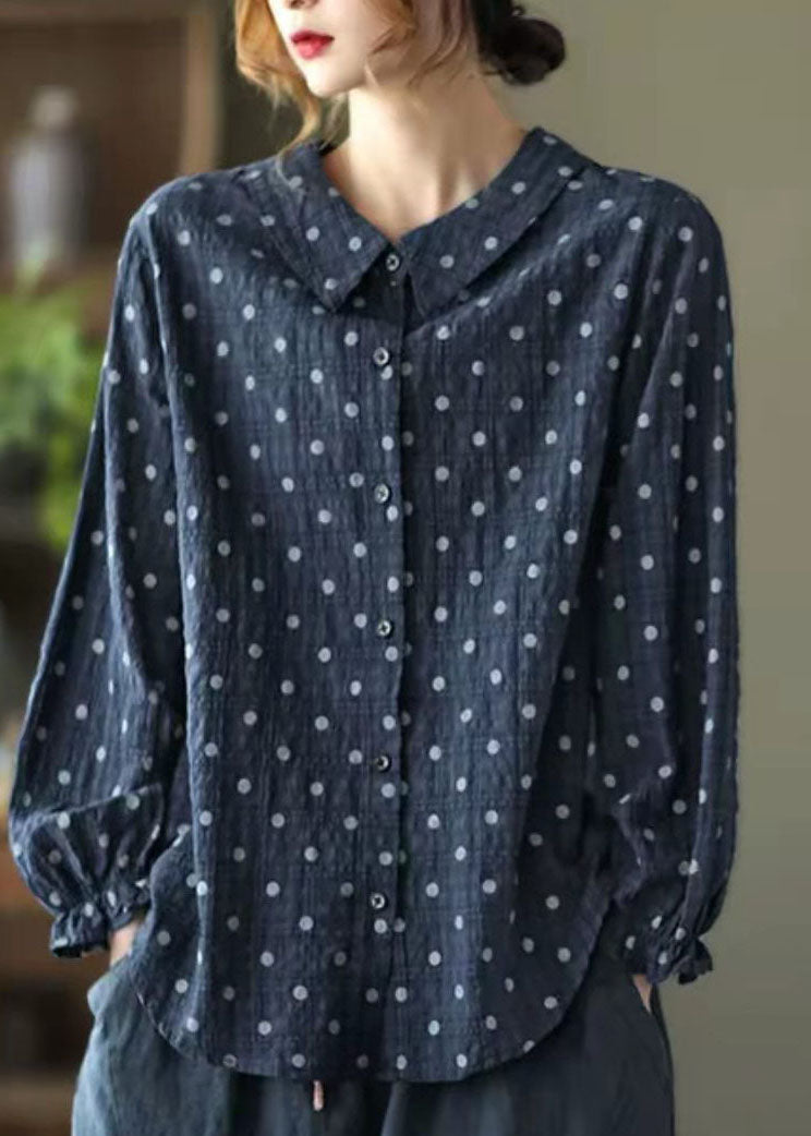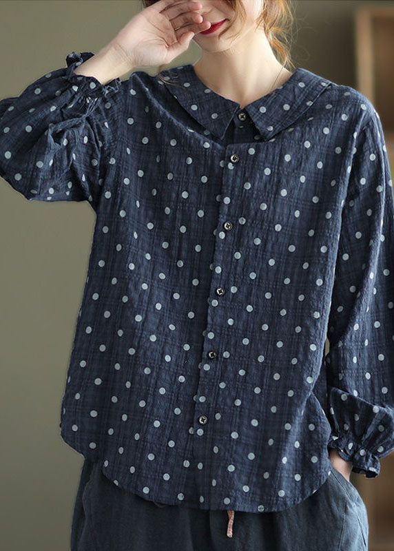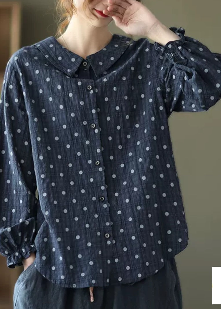 Lässiges, marineblaues Hemd mit Peter-Pan-Kragen und Punktemuster, Laternenärmel