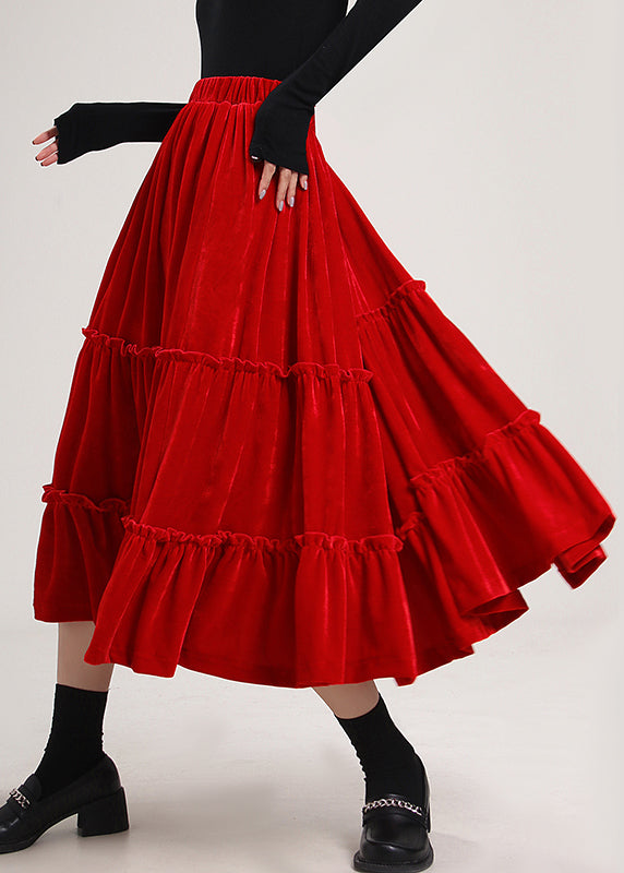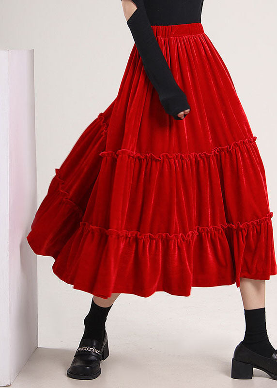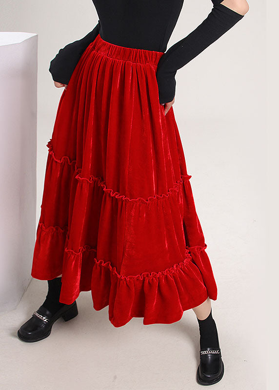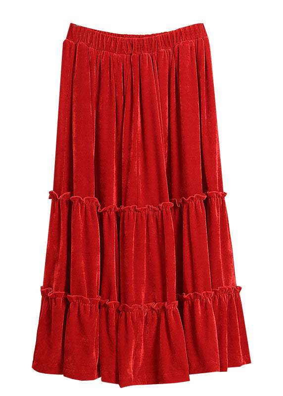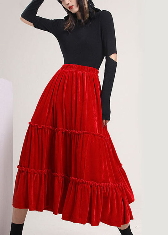 Lässiger roter Patchwork-Rock aus Seidenvelours mit Rüschen