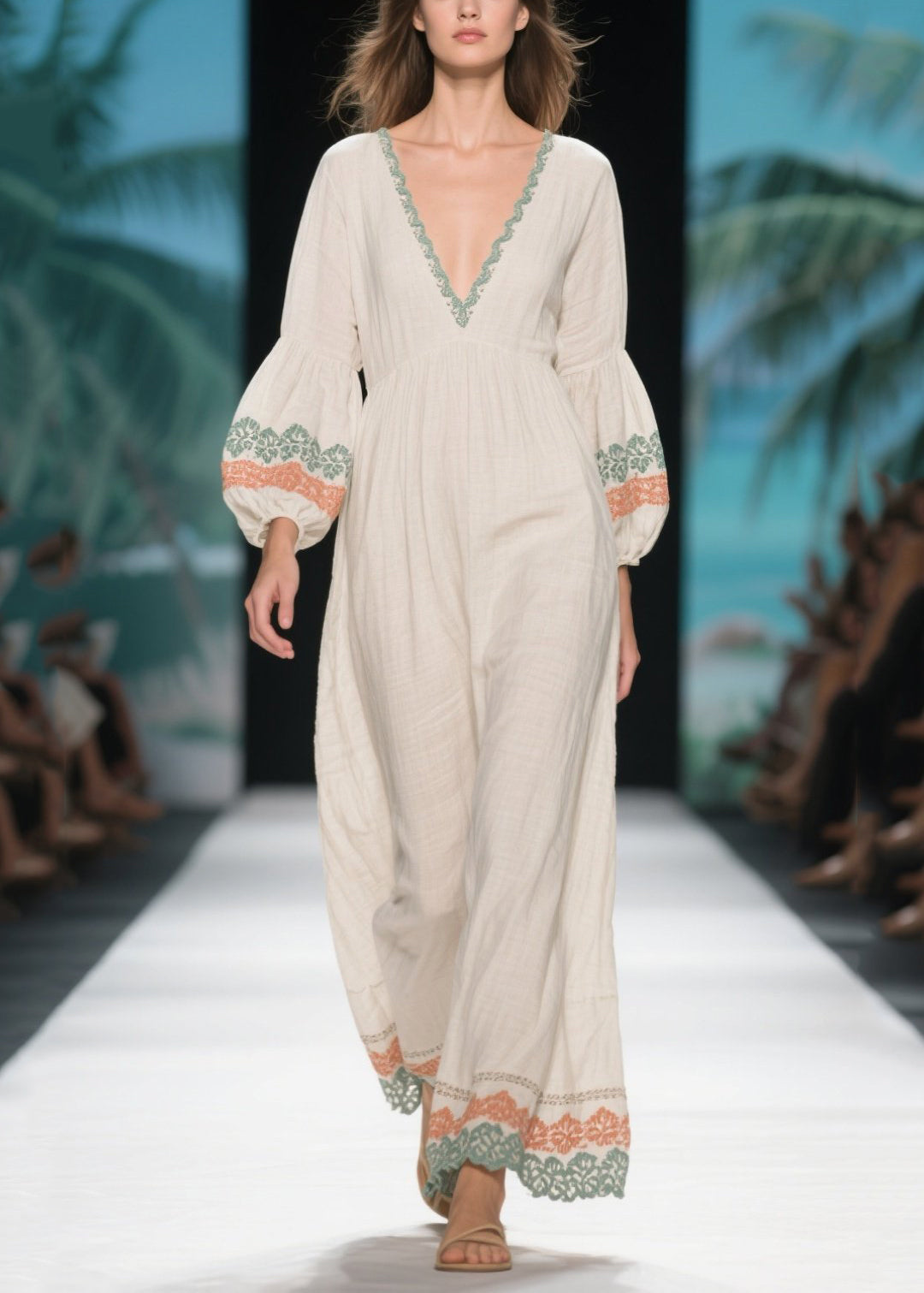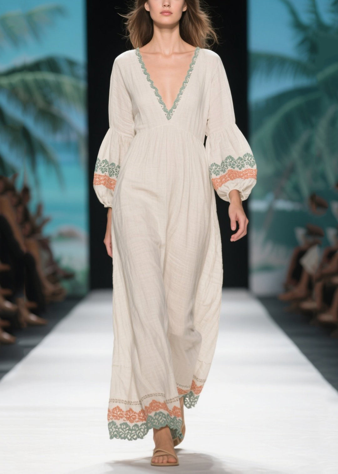 Casual White V Neck Patchwork Linen Dress Lantern Sleeve