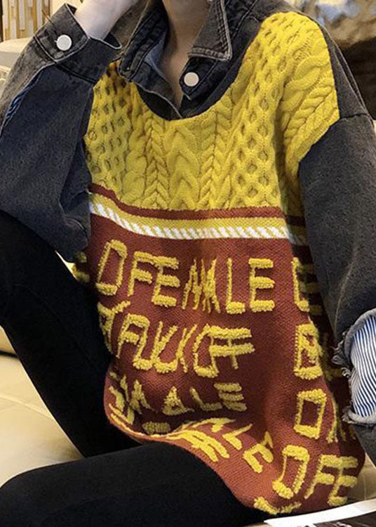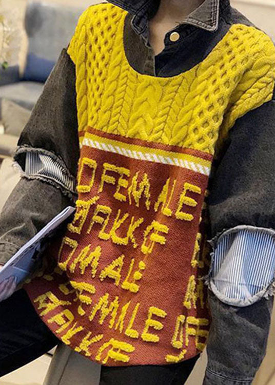 Lässiges, gelbes, lockeres Jacquard-Strickoberteil mit Patchwork-Print
